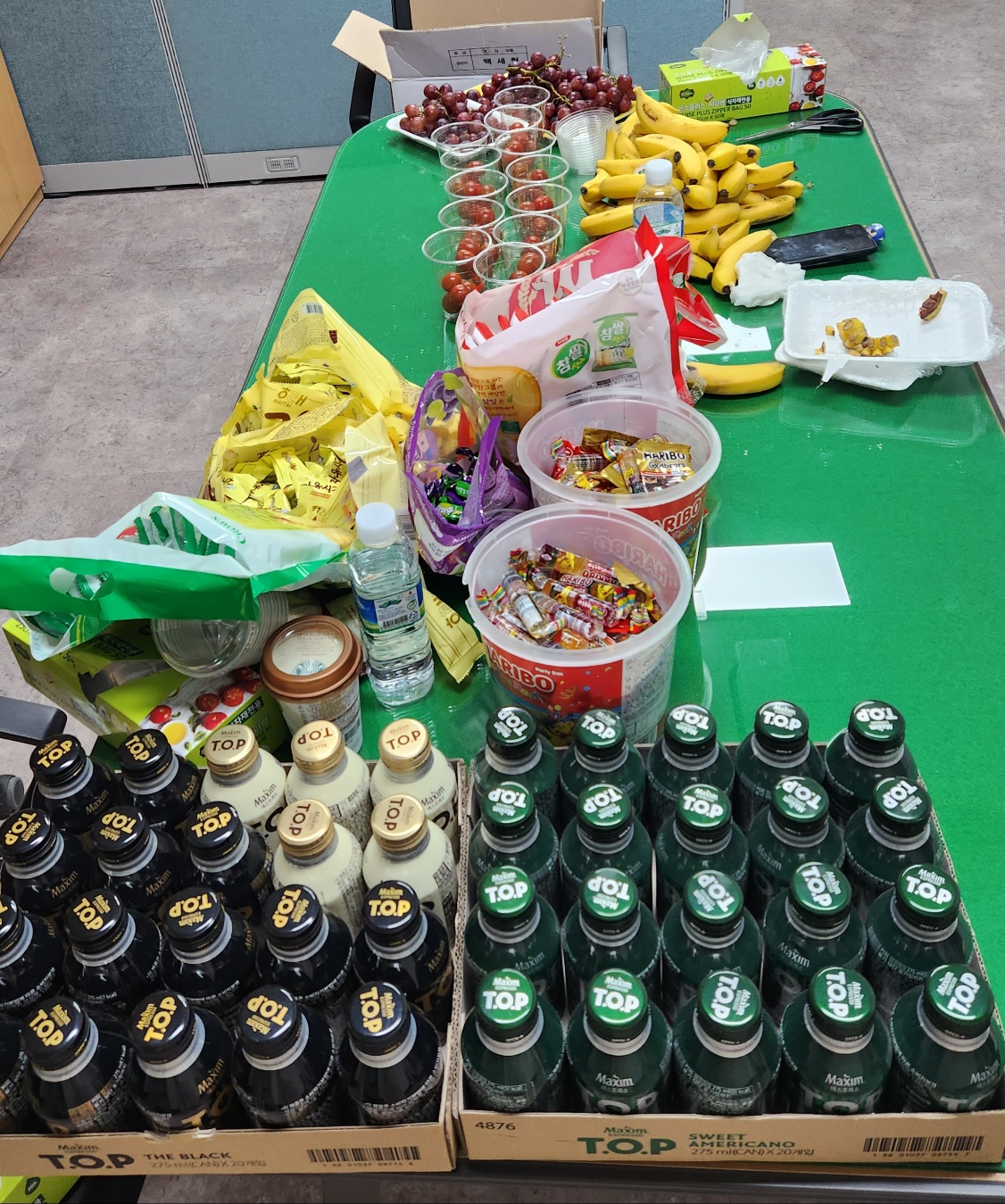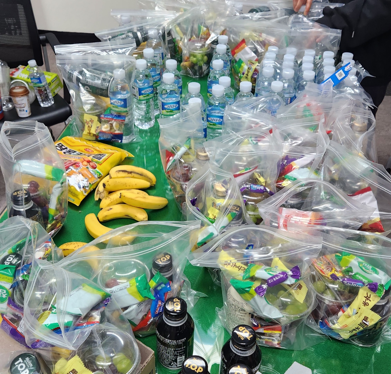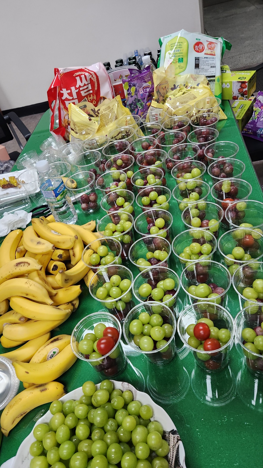 목이 마를까봐 물, 그리고 후식으로 3색의 과일, 기운내라고 달달한 사탕과 하리보, 바나나 등을 준비한 후 인원에 맞게 지퍼팩에 담아 교수님의 사랑을 전달을 했다.