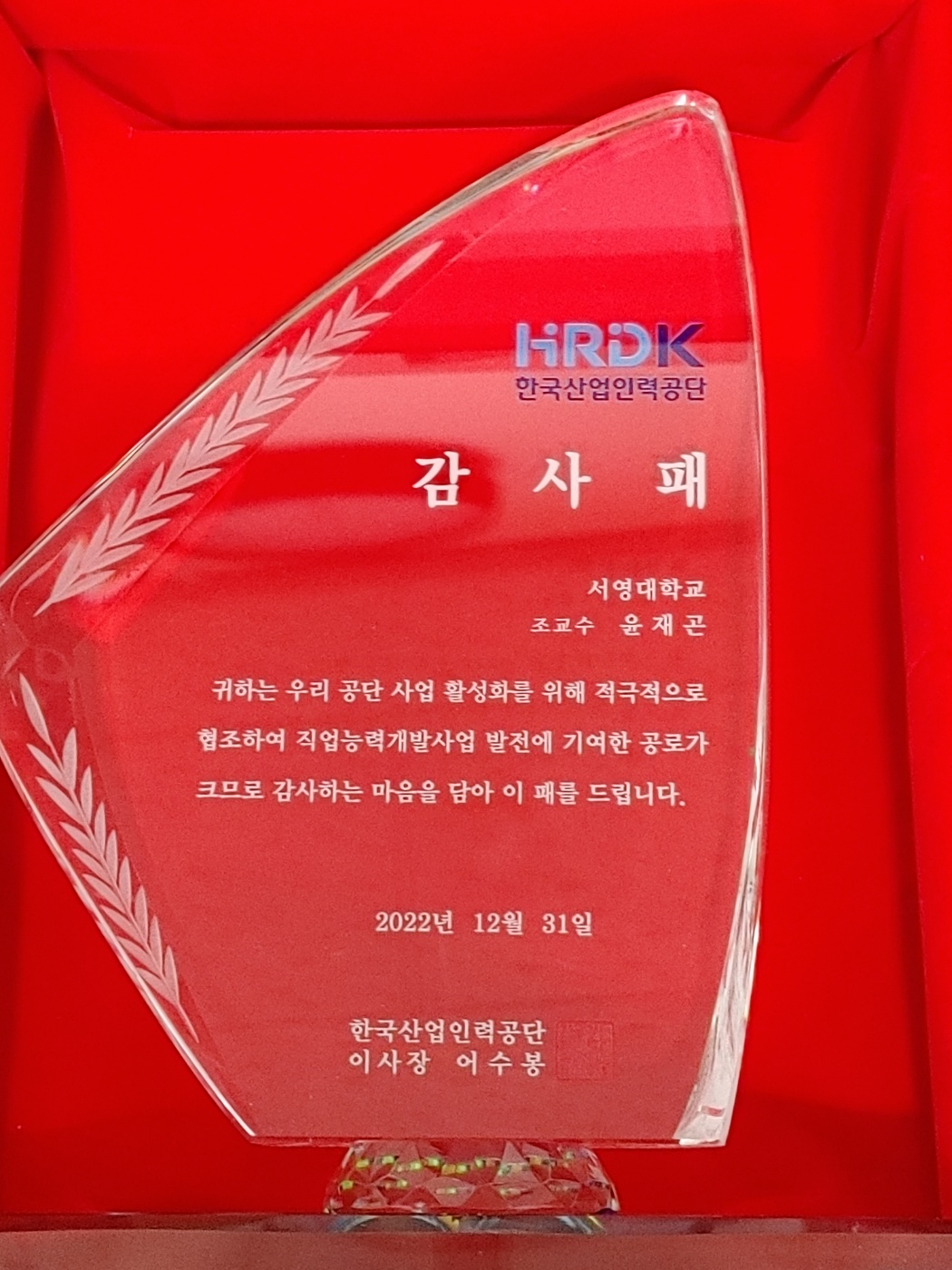 우리 자동차과 윤재곤교수가 한국산업인력공단에서 직업능력개발사업 발전에 기여한 공로로 감사패을 수상하였습니다.