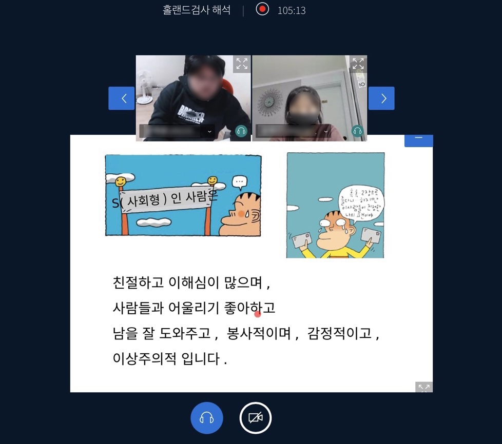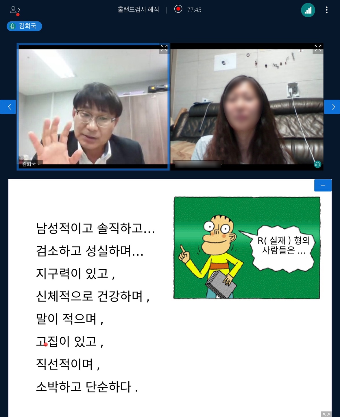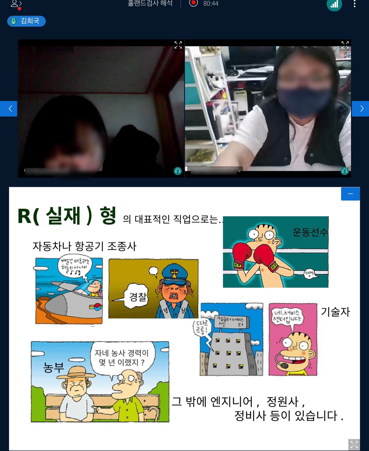 - 내용 : 진로 적성의 4가지 영역과 성격 유형을 바탕으로 사전 실시한 직업 적성 검사 결과를 실제 경험담을 토대로 학생들과 함께 해석풀이를 진행하였습니다.