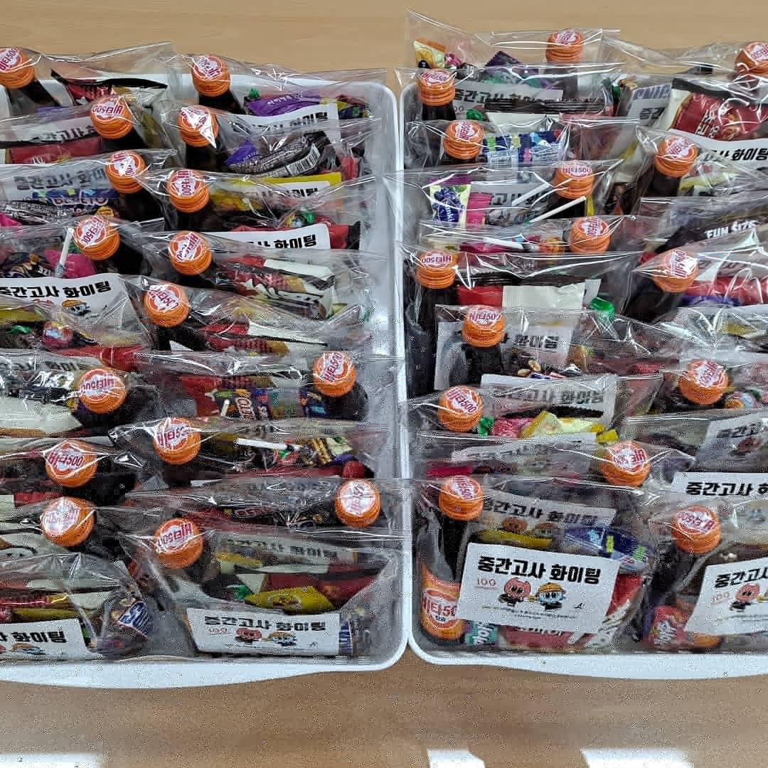 간식선물은 중간고사 기간동안 각 반 대표들을 통해 전달하였습니다.