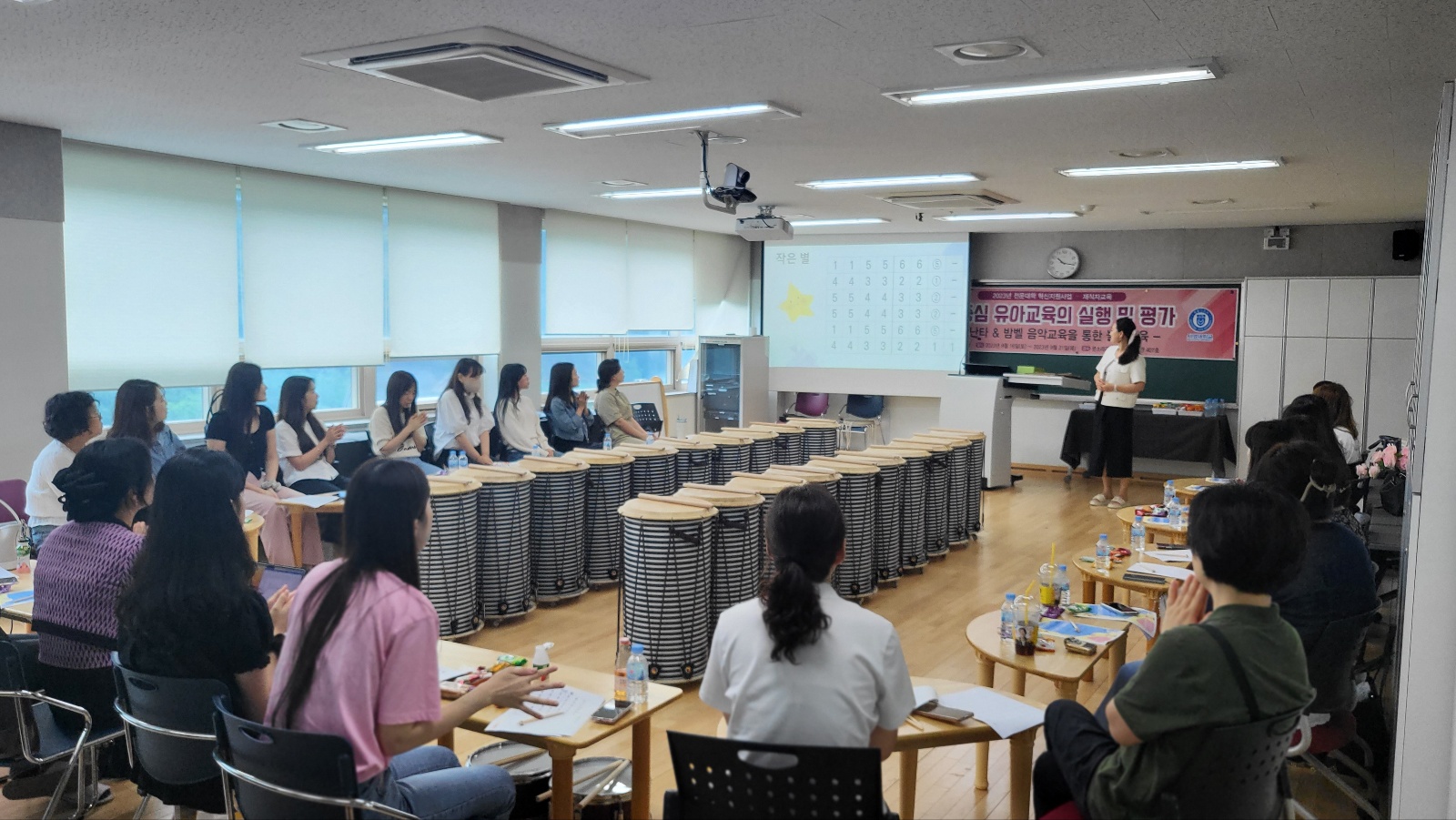 - 내용 : 9/16 (토) '놀이중심 유아교육의 실행 및 평가' 주제로 영유아교육기관 재직자들을 위한 특강을 실시하였습니다. 특강은 놀이중심 유아교육의 이론적 기초에 대한 강의를 시작으로 놀이중심 유아교육지원을 위한 음악 놀이 사례연구(유아 난타 북과 앙클루 악기를 활용한 놀이교육의 실제) 및 놀이중심 유아교육 평가법의 연구 순서로 진행되었습니다.