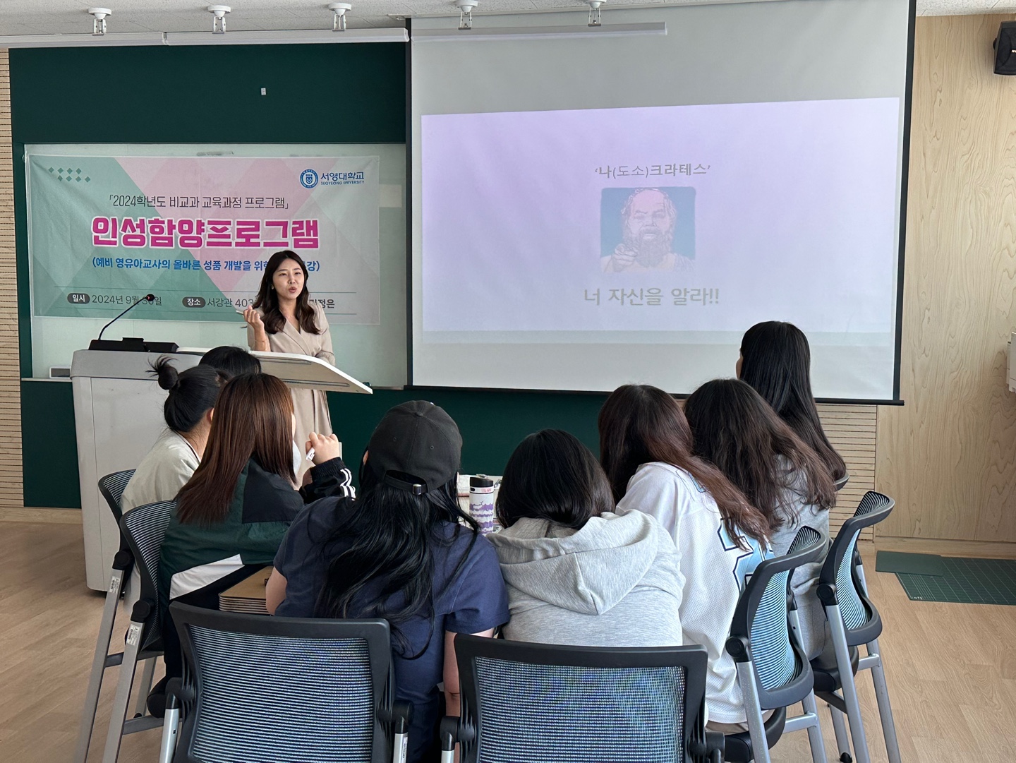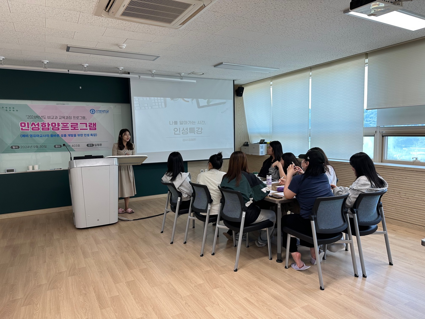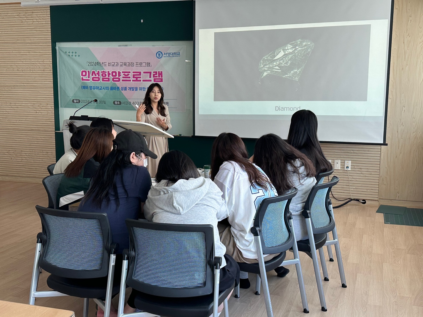 - 내용 : 그림을 통해 자기를 이해해보는 시간을 가져보고 DISC검사를 통해 나의 성격유형을 파악해보았습니다. 또한, 나의 강점을 찾아본 후 유아교사로서 필요한 강점과 피드백을 친구들끼리 교환해보고, 유아 및 학부모와의 상호작용에서의 소통방법, 공감과 팀워크 향상 게임 등을 알아보며 예비 영유아교사의 올바른 인성을 기르는 시간이 되었습니다.