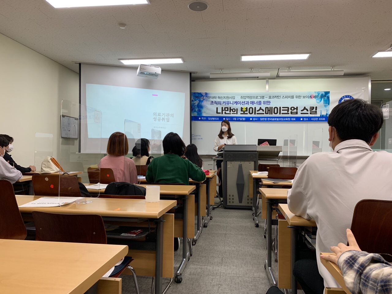 우리 대학 임상병리과는 9월 27일 3학년 학생들을 대상으로 성공적인 취업을 위한 "나만의 보이스메이크업 스킬"이라는 주제로 특강을 진행하였습니다 특강을 위해 한국글로벌코칭교육원 장은영 대표님께서 바쁘신 와중에도 어렵게 시간을 내주어 졸업을 앞둔 우리 대학 임상병리과 3학년 학생들을 위해 2시간 가량 수고를 해주셨습니다