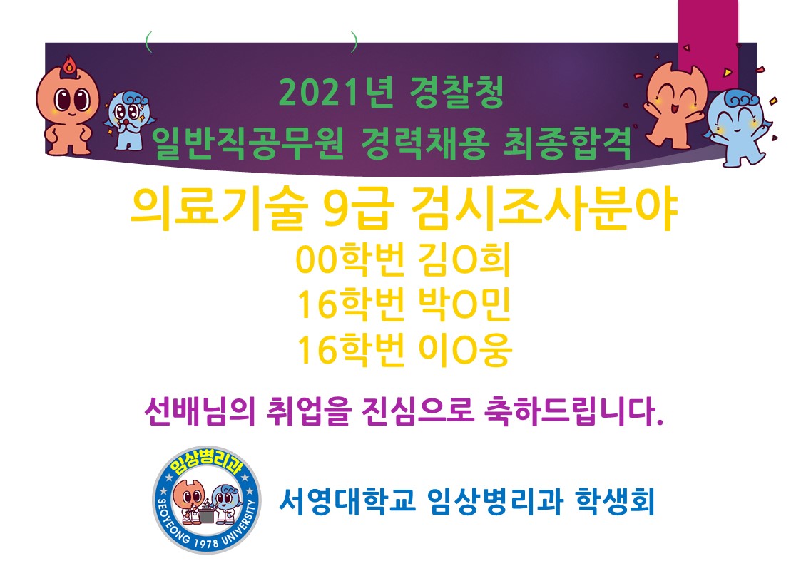 2021년 경찰청 공무원 채용에 우리 학과 00학번 김O희 , 16학번 박O민, 16학번 이O웅 총 3명의 동문이 의료기술 9급(검시조사분야)에 최종합격하였습니다 2021년 상반기에 신O라 선배님의 합격소식에 이어 또 한번 검시조사 분야에 합격하는 쾌거를 이루었습니다