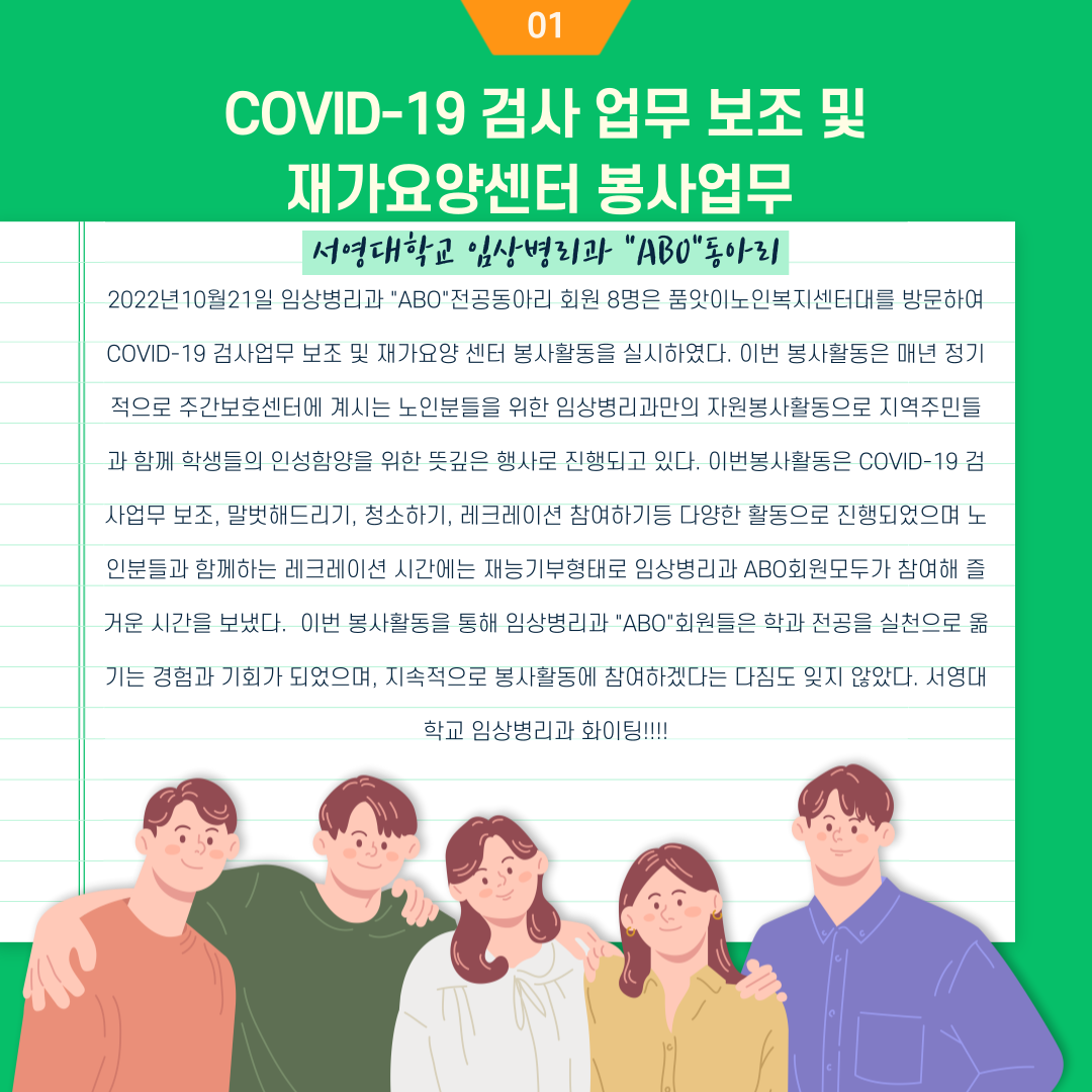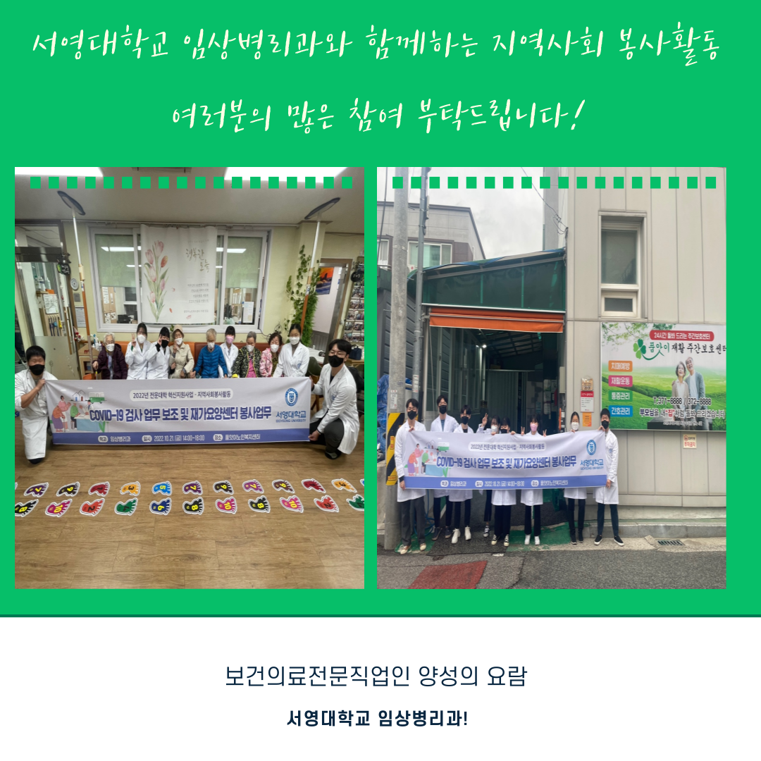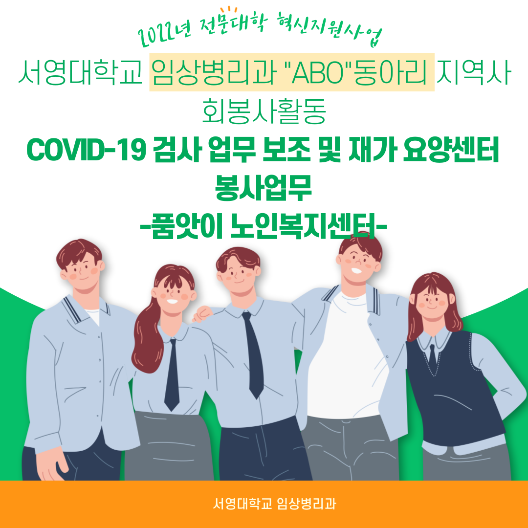 20221021일 임상병리과 “ABO” 전공동아리 회원 8명은 품앗이노인복지센터대를 방문하여 COVID-19 검사업무 보조 및 재가요양 센터 봉사활동을 실시하였다. 이번 봉사활동은 매년 정기적으로 주간보호센터에 계시는 노인분들을 위한 임상병리과만의 자원봉사활동으로 지역주민들과 함께 학생들의 인성함양을 위한 뜻깊은 행사로 진행되고 있다. 이번봉사활동은 COVID-19 검사업무 보조, 말벗해드리기, 청소하기, 레크레이션 함께 참여하기 등 다양한 활동으로 진행되었으며 노인분들과 함께하는 레크레이션 시간에는 재능기부형태로 임상병리과 ABO 회원 모두가 참여해 즐거운 시간을 보냈다. 이번 봉사활동을 통해 임상병리과 “ABO” 회원들은 학과 전공을 실천으로 옮기는 경험과 기회가 되었으며, 지속적으로 봉사활동에 참여하겠다는 다짐도 잊지 않았다. 서영대학교 임상병리과 파이팅!!