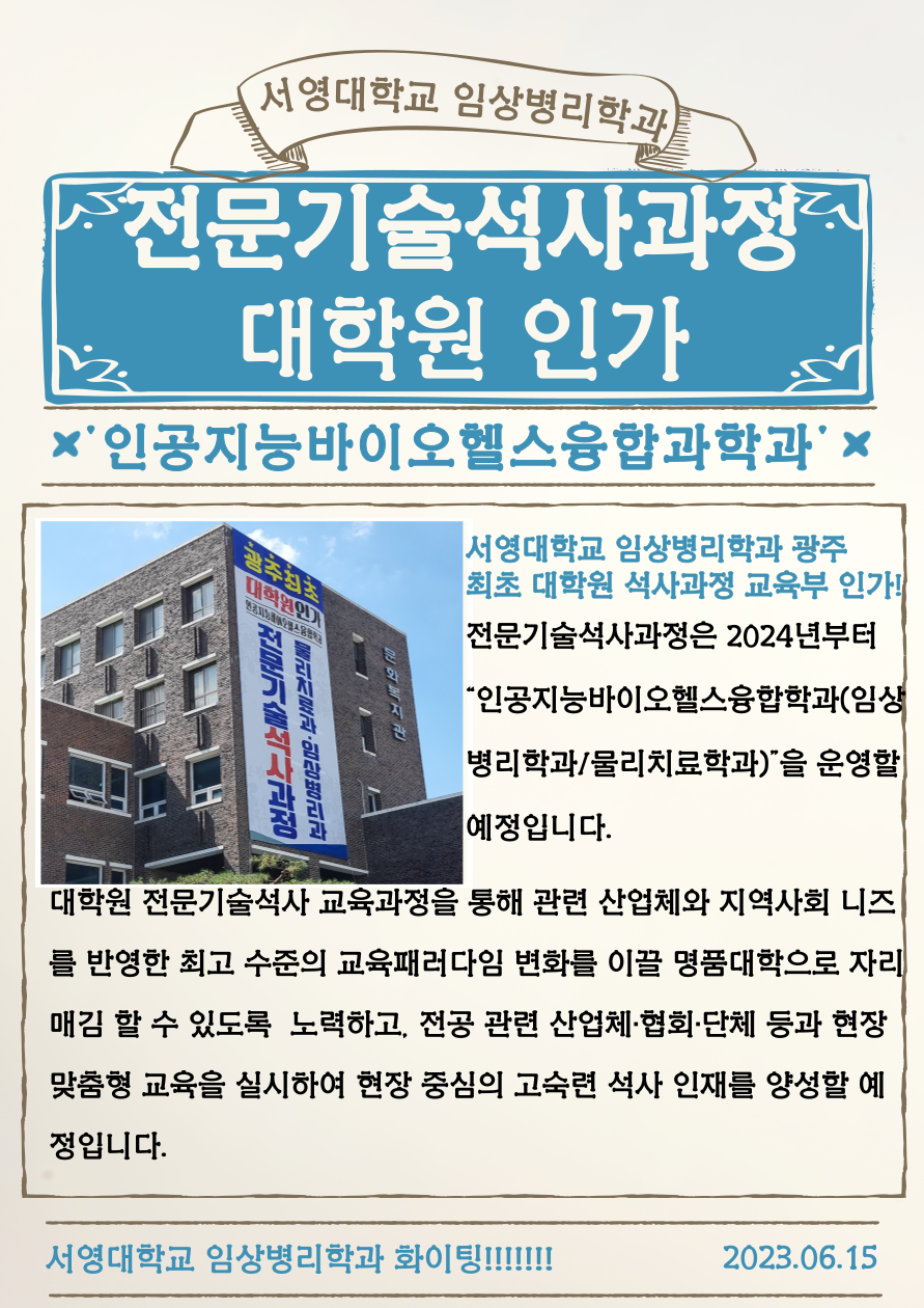 전문기술석사과정은 2024년부터 “인공지능바이오헬스융합학과(임상병리학과/물리치료학과)”을 운영할 예정입니다.