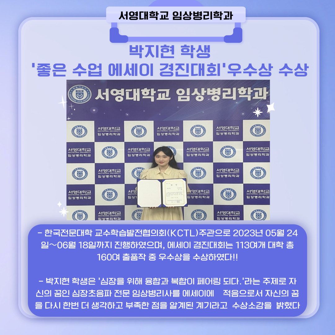 - 박지현 학생은 ‘심장을 위해 융합과 복합이 페어링 되다.’라는 주제로 자신의 꿈인 심장초음파 전문 임상병리사를 에세이에 적음으로서 자신의 꿈을 다시 한번 더 생각하고 부족한 점을 알계된 계기라고 수상소감을 밝혔다