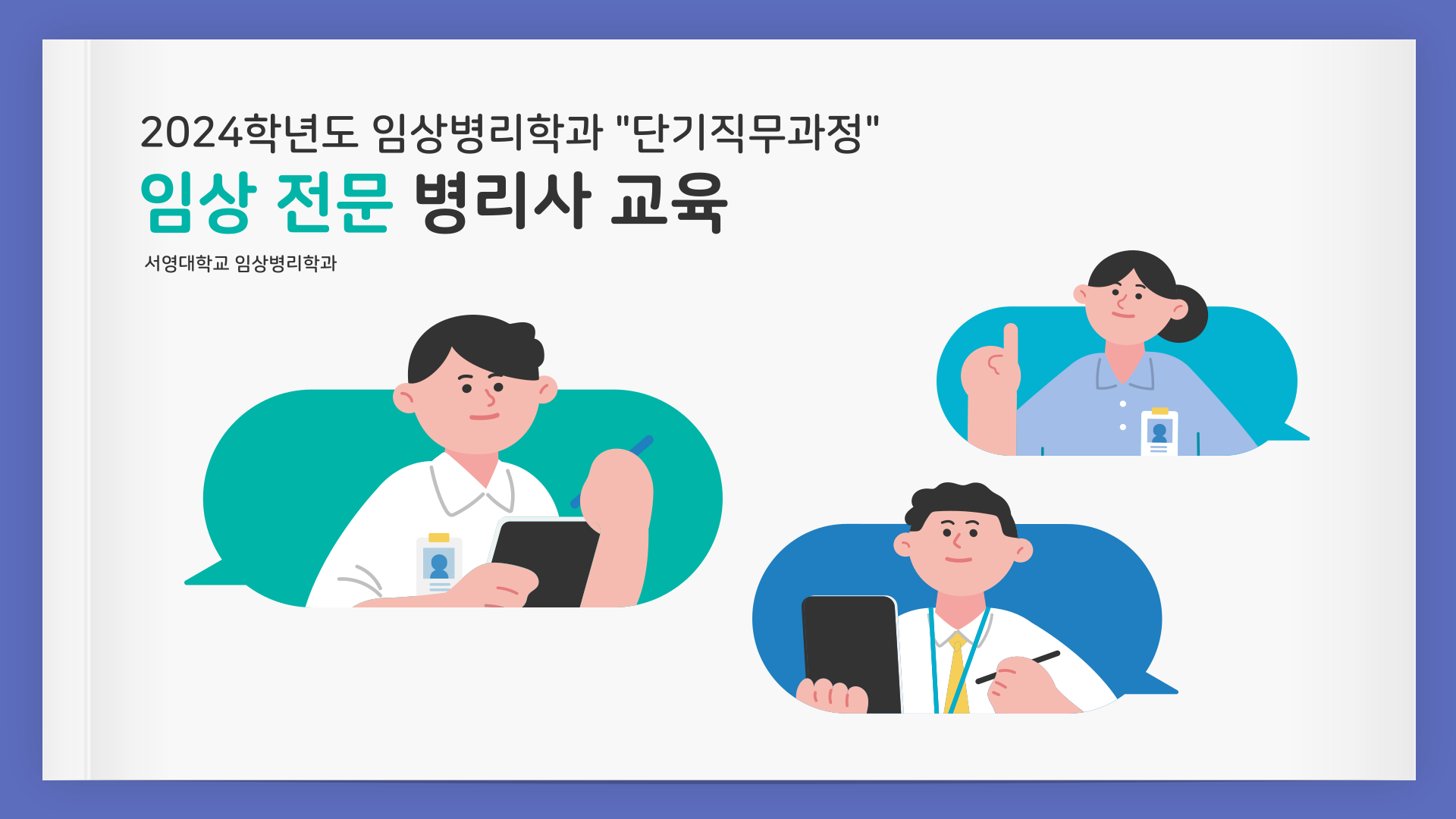 서영대학교 임상병리학과에서는 임상전문병리사 단기직무과정을 운영하고 있습니다. 이번 교육은 1학년 학생들을 대상으로 진행하고 있으며, 임상병리분야의 유능하신 산업체 전문가 분께서 특별히 학생들에게 다양한 임상병리학분야를 학생들에게 소개하여 전공 역량 강화 및 향후 취업에도 많은 도움을주고 계십니다. 또한 서영대학교는 전문기술석사과정을 인가받아, 단기직무과정-전문학사-전공심화-전문기술석사과정를 연계하여 고숙련 AI기반 스마트진단검사분석 전문가를 양성할 계획입니다.!!