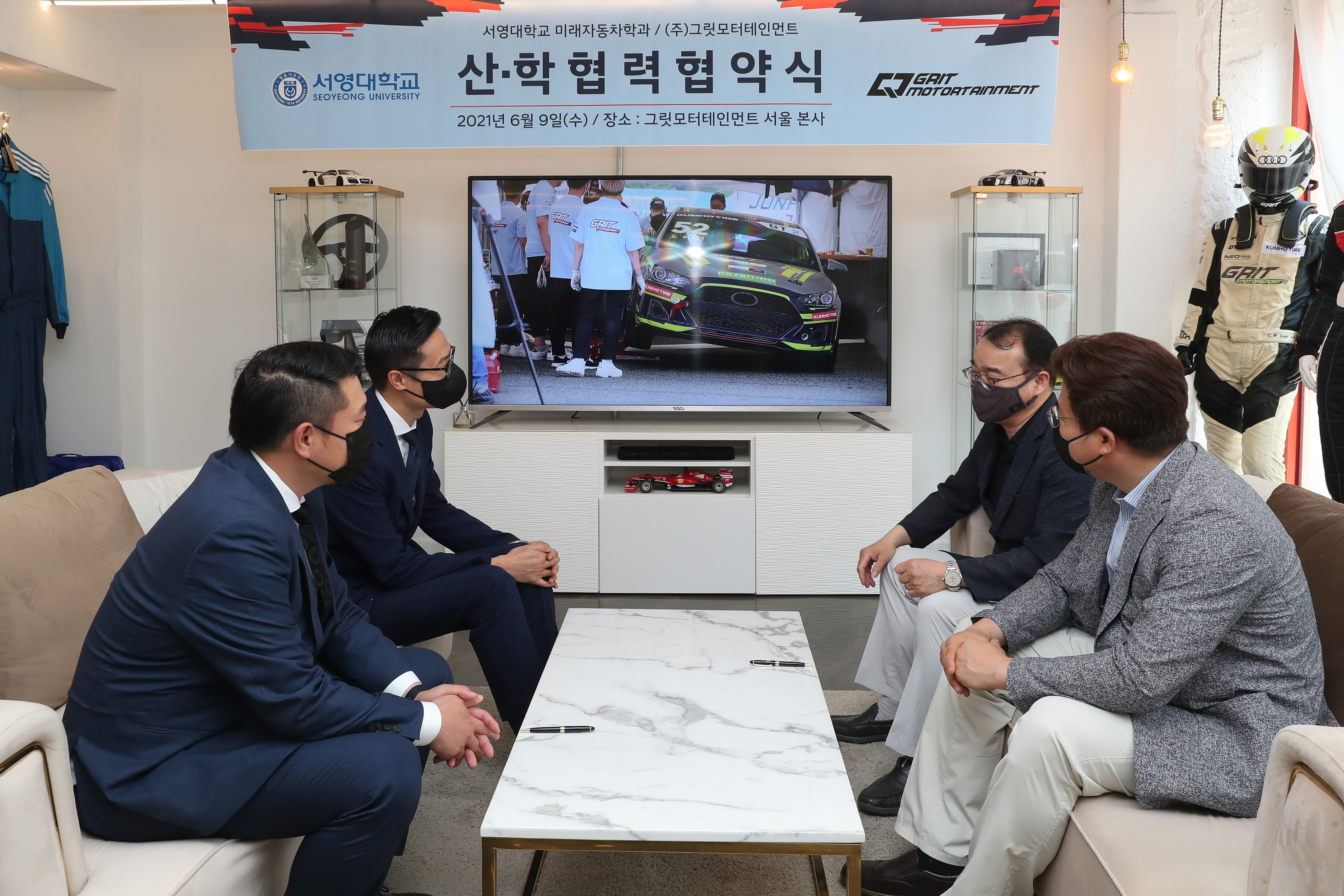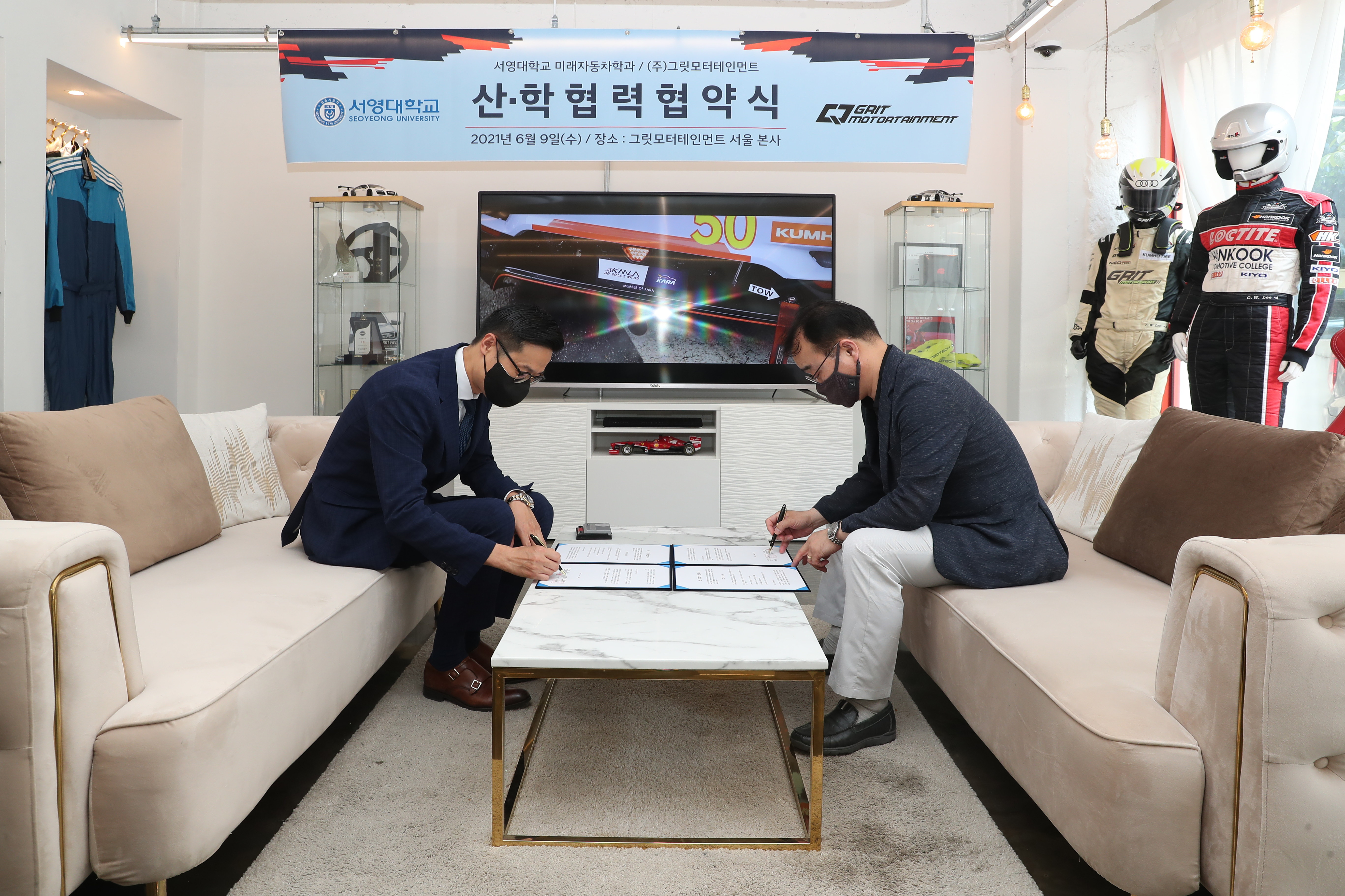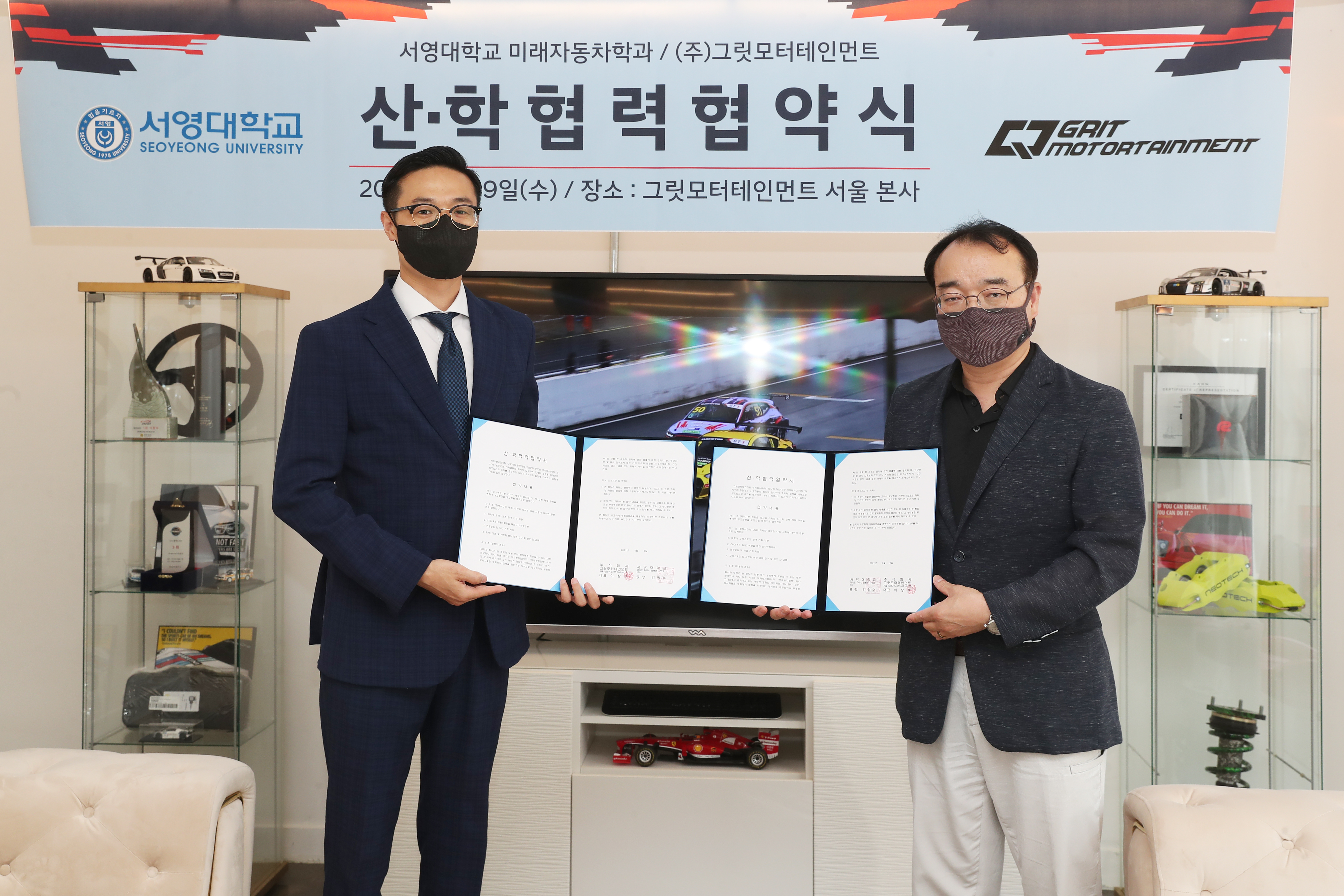 2021년 06월09일 서영대학교 미래자동차과와 그릿모터스포츠팀과 MOU를 체결하였습니다. 협약내용으로는 재학생 모터스포츠 참여 기회 제공, CEO(혹은 팀원)특강을 통한 산학인력교류, 현장실습 및 취업 기회지원, 모터스포츠 및 자동차튜닝 공동 연구 및 상호 간 교류 입니다. 이렇게 다양한 산업체 및 기업과 MOU를 통하여 재학생 및 졸업생분들에게 다양한 역량강화 기회제공, 많은 체험기회 등을 통하여 학훈인 재밋게 놀고, 재밋게 공부하자를 매일매일 실현하는 학과가 되겠습니다! MOU를 통해 재학생들에게 더 좋은 길을 열어주신 그릿모터테인먼트에게 감사드립니다~