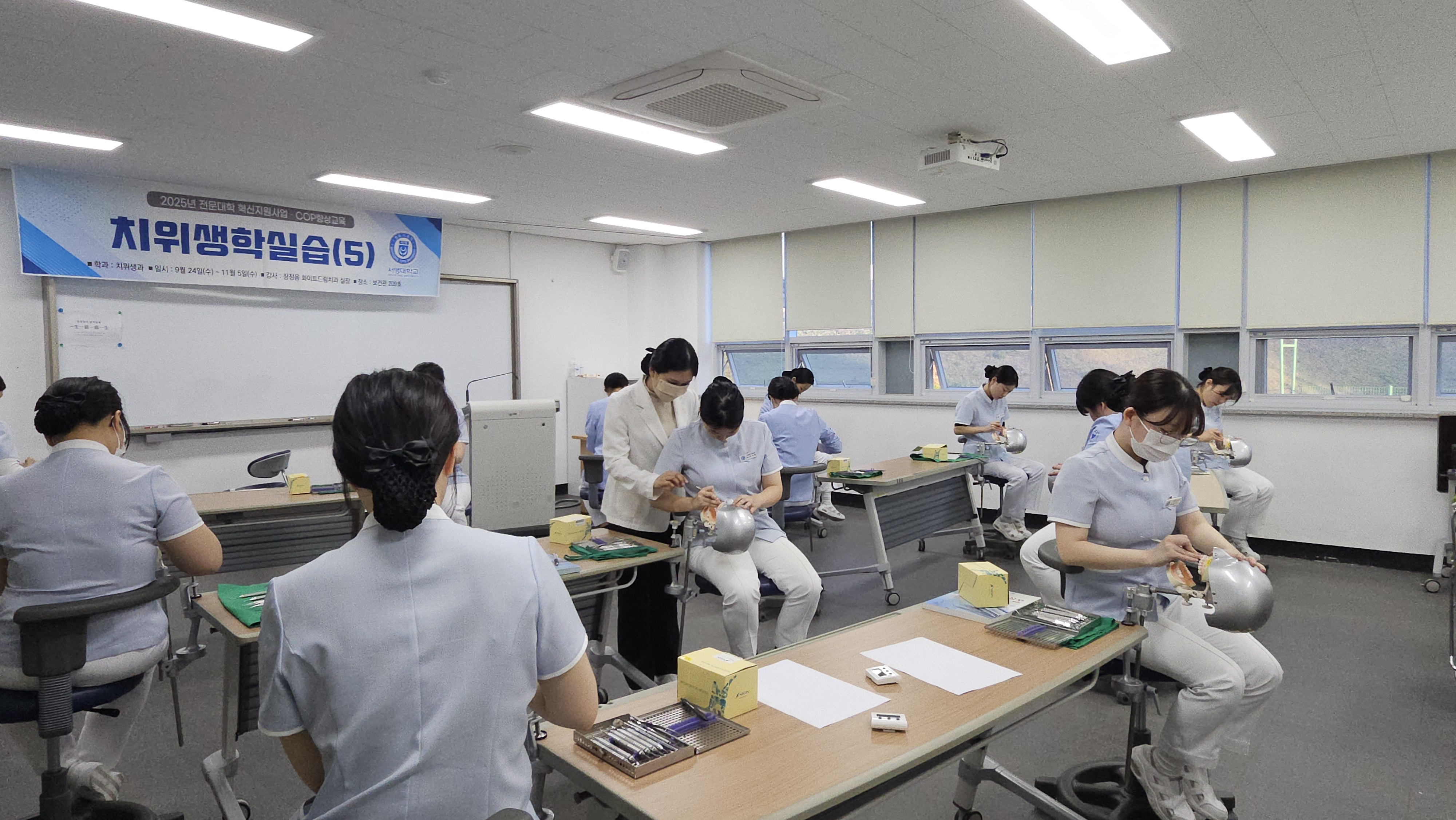 치위생학실습(5) 교과목과 관련하여 COP 향상교육을 실시하였습니다.□대상: 3학년 10명□일시: 2025년 9월 24일 ~ 11월 5일□장소: 보건관 209호□강사: 화이트드림치과 장*음 실장
