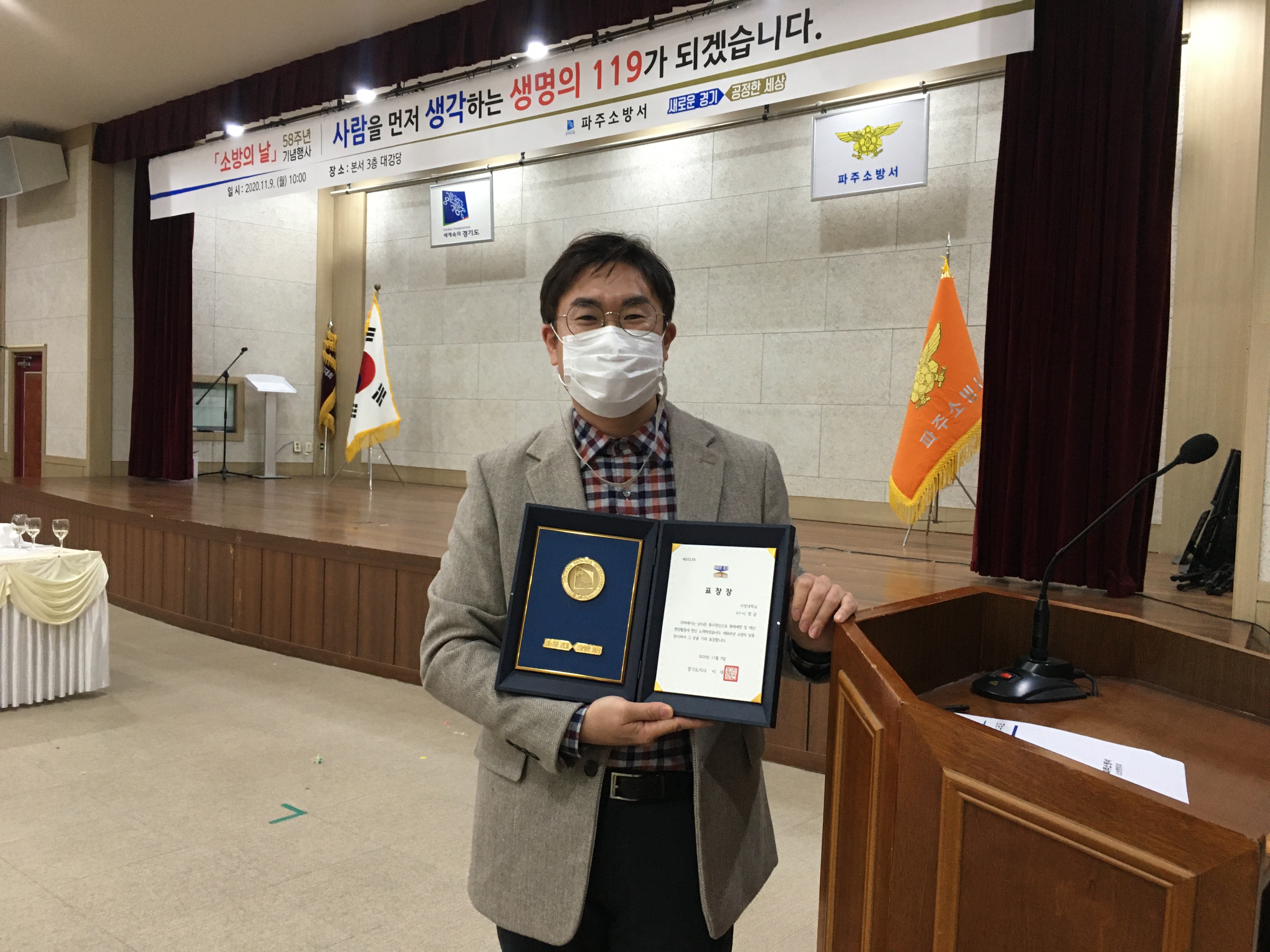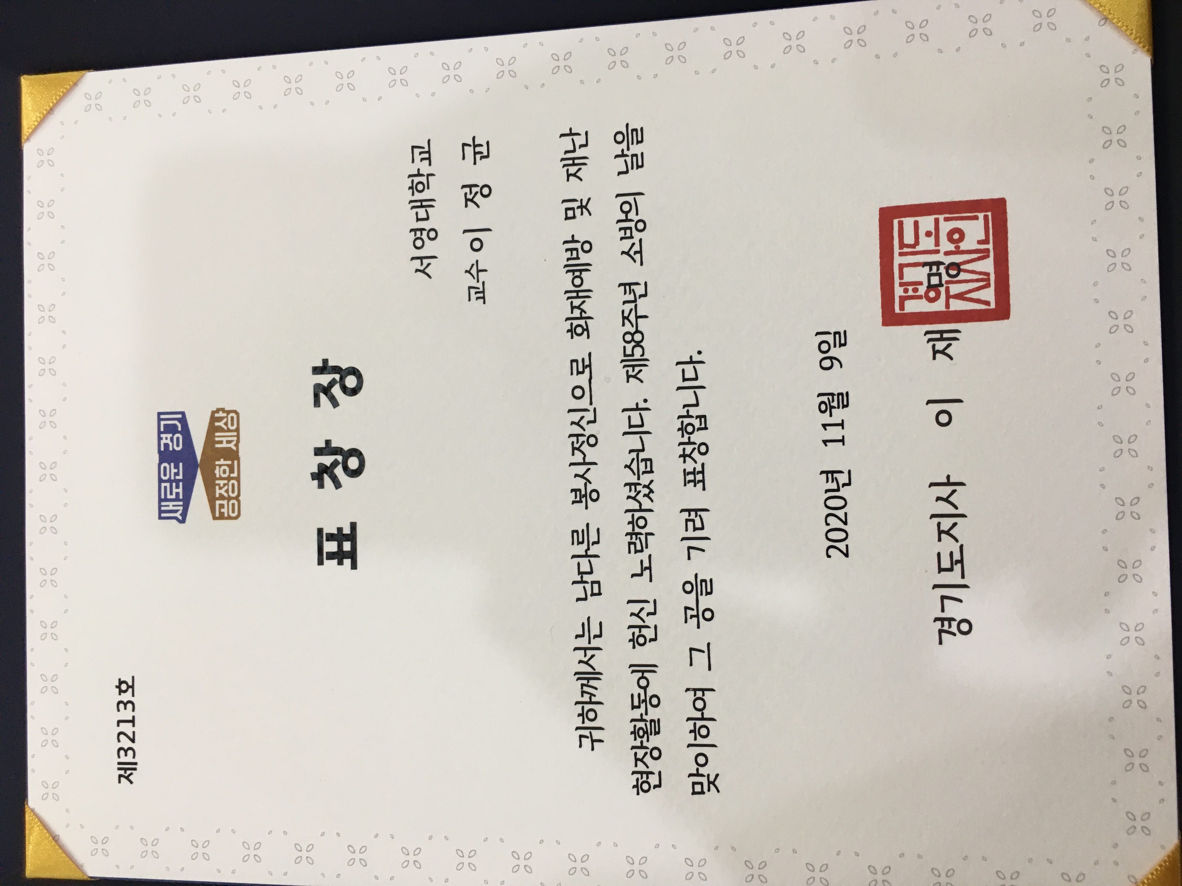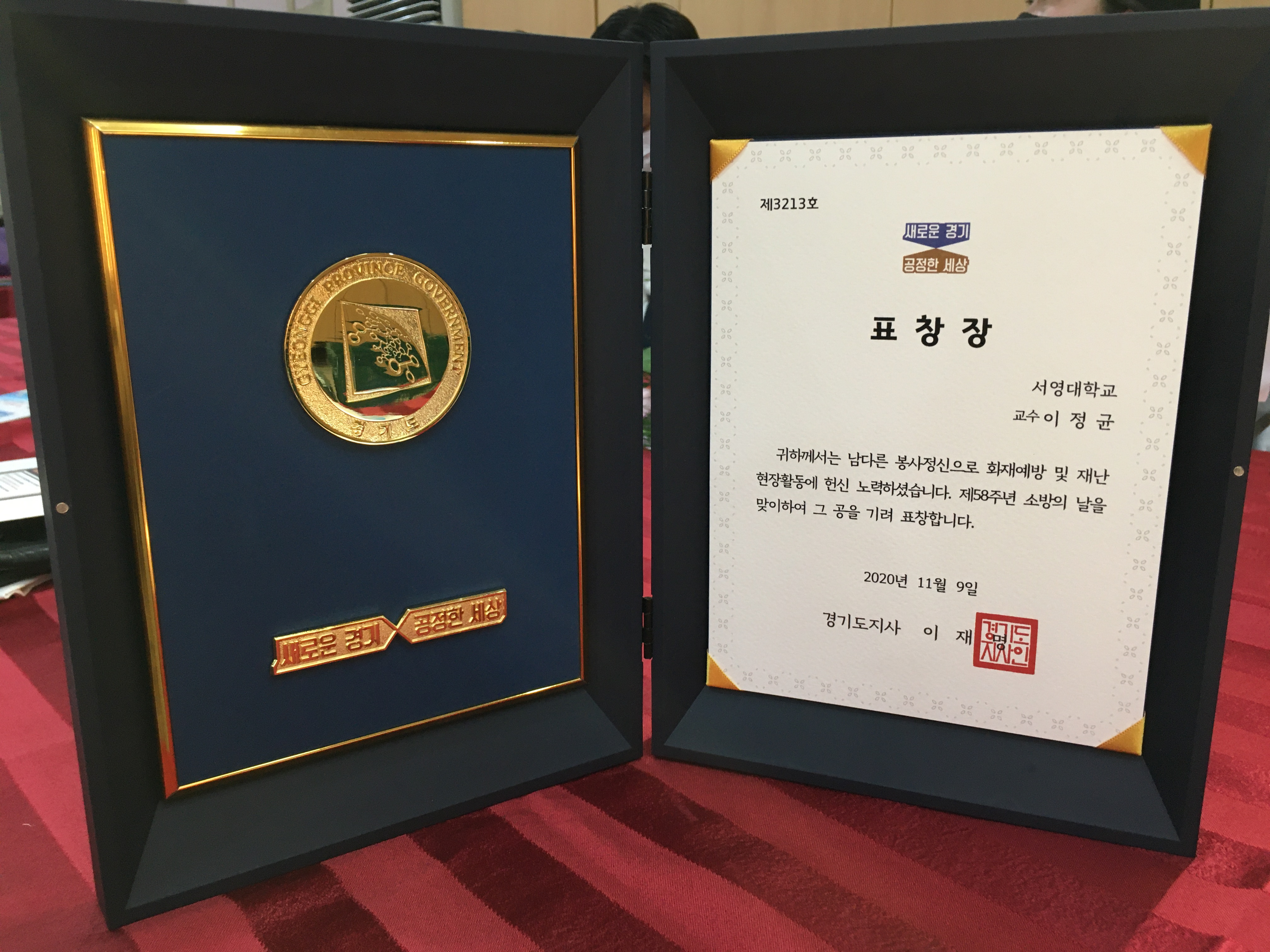 이정균 교수님이 파주소방서 추천으로 경기도 지사 표창을 수상 하셨습니다~~