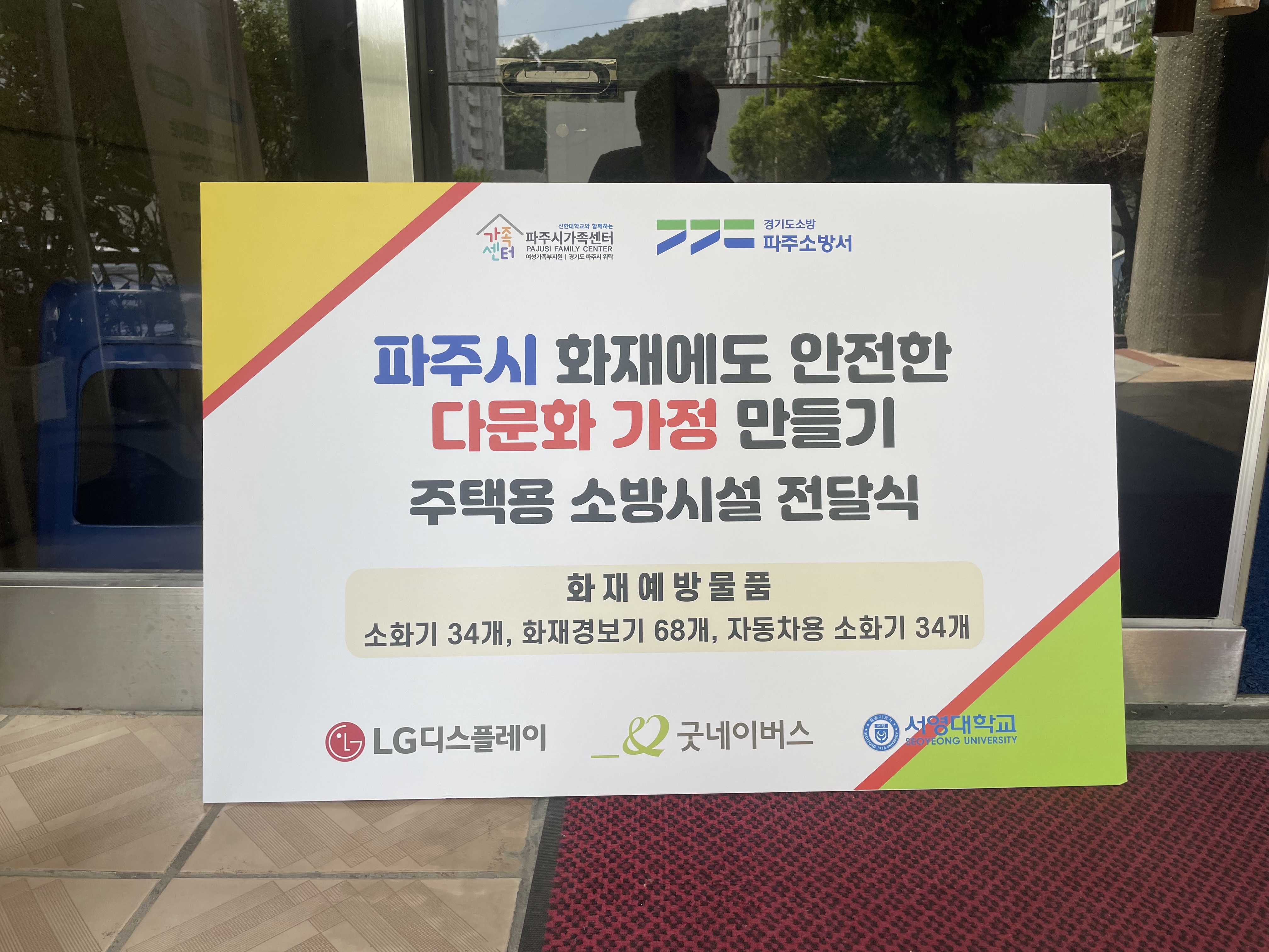 O.우리대학(총장 김정수)소방안전과(학과장 천종철)는7월28일(금)다문화가정을 위한‘주택용 소방시설 전달식’에 참여하였다.파주시가족센터에서 진행된 행사는 파주시가족센터를 통한 다문화가정 소방안전 물품 보급을 위한 계획에 따라 파주소방서(서장 정찬영)와 굿네이버스, LG디스플레이 및 서영대학교 교수지원단이 함께 참여하였다. O. ‘주택용 소방시설 전달식’에서는 파주관내 다문화가정34개소를 대상으로 주택용 소방시설에 대한 홍보와 소방용품 전달 및 방문설치가 진행되었다.이번 행사에서 우리대학 소방안전과에서는 다문화가정 소방시설 지원을 위한 화재안전물품(에어로졸)을 후원하고,가정 내 소방용품의 전달 및 방문설치에 동참하였다. O.파주소방서 정찬영 서장은‘다문화가정은 대체로 재난복지의 사각지대에놓여 있어 전방위적 지원이 필요하다.지역협의체를 통한 안전교육,예방물품의 지원 등이 지속적으로 이루어질 수 있도록 노력하겠다’고 전했다.서영대학교 교수지원단 이정균교수는‘지역내 다문화 가정에도안전문화를 보급하는 좋은 행사에 동참하게 되어 매우 뜻깊은 시간이었다.화재예방을 통한 안전사회 만들기에 앞으로도 열심히 동참하겠다.’고 말하였다.