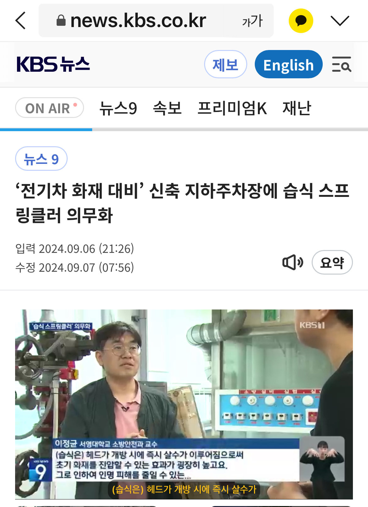 2024.9.6  KBS 1TV  뉴스9   - 전기차 화재 대책 발표 - 습식 스프링클러 도입에 관하여