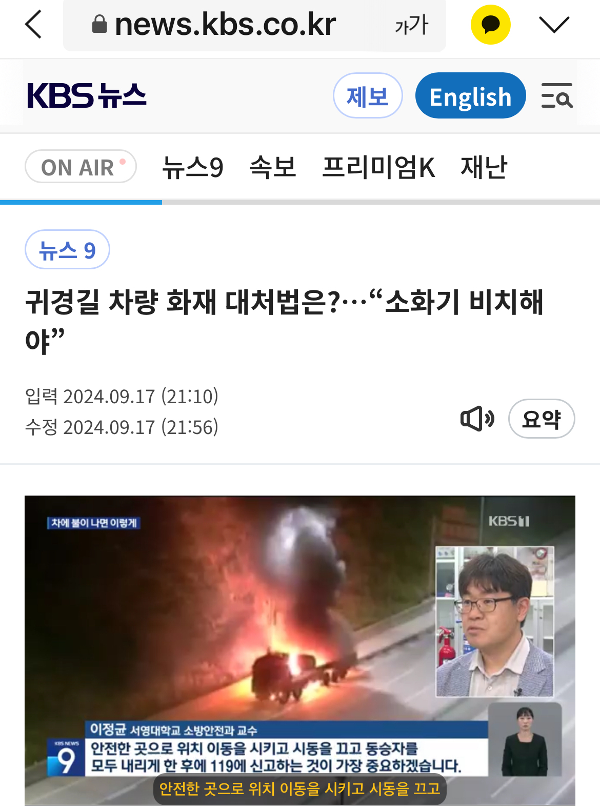 2024.9.17  KBS 1TV 뉴스9   - 차량 화재 시 대피 요령 에 관하여
