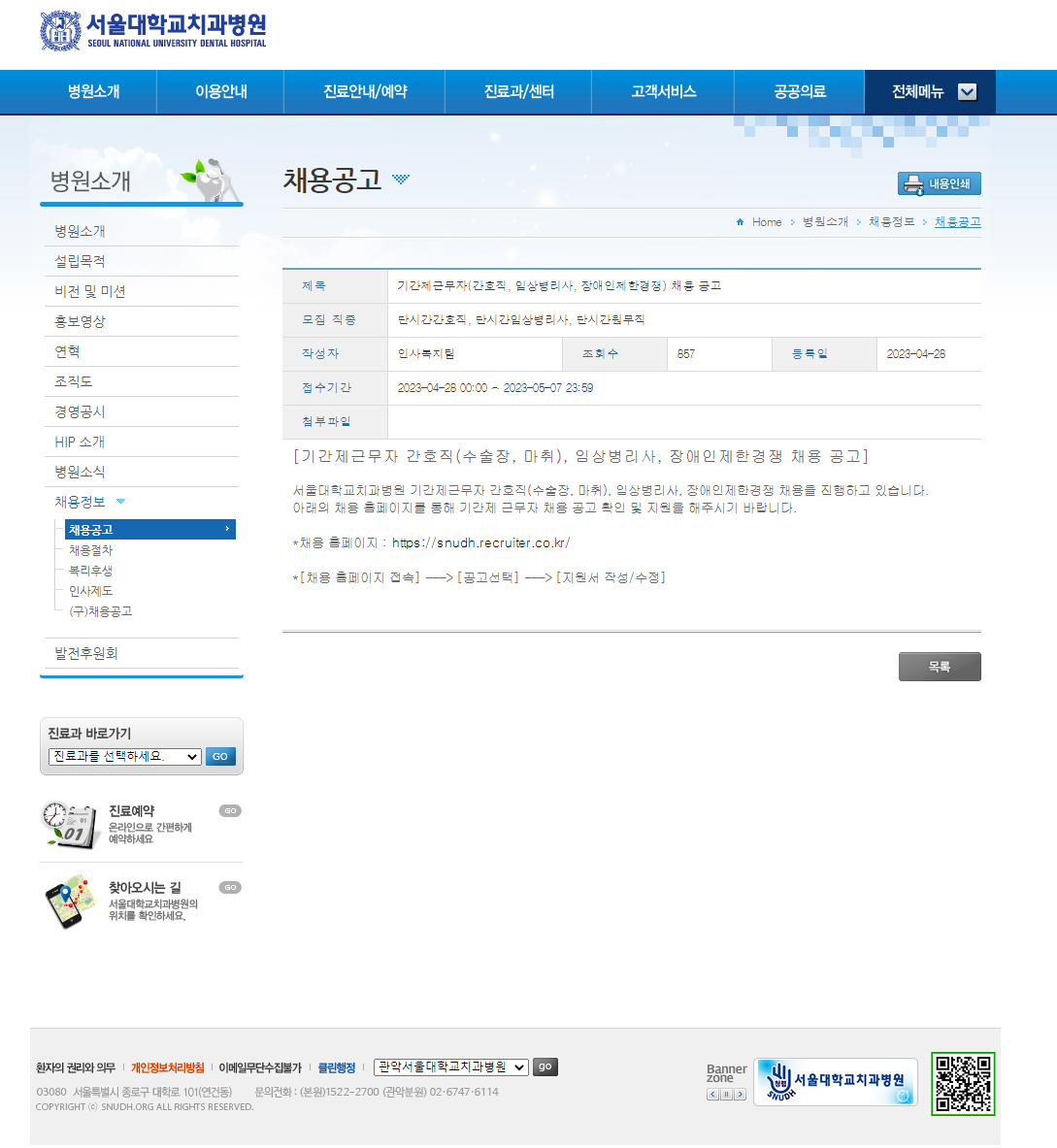 입사 지원: 채용공고 - home>병원소개>채용정보>채용공고 (snudh.org)