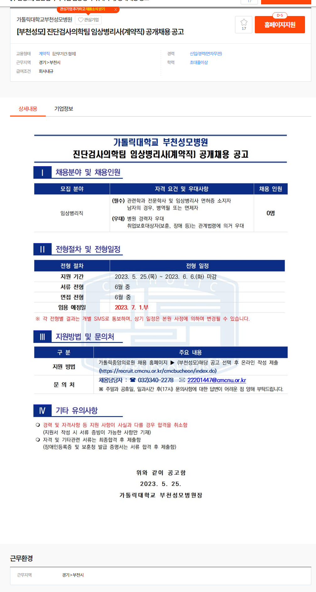 가톨릭대학교부천성모병원 채용 : [부천성모] 진단검사의학팀 임상병리사(계약직) 공개채용 공고 - 인크루트 채용정보 (incruit.com)