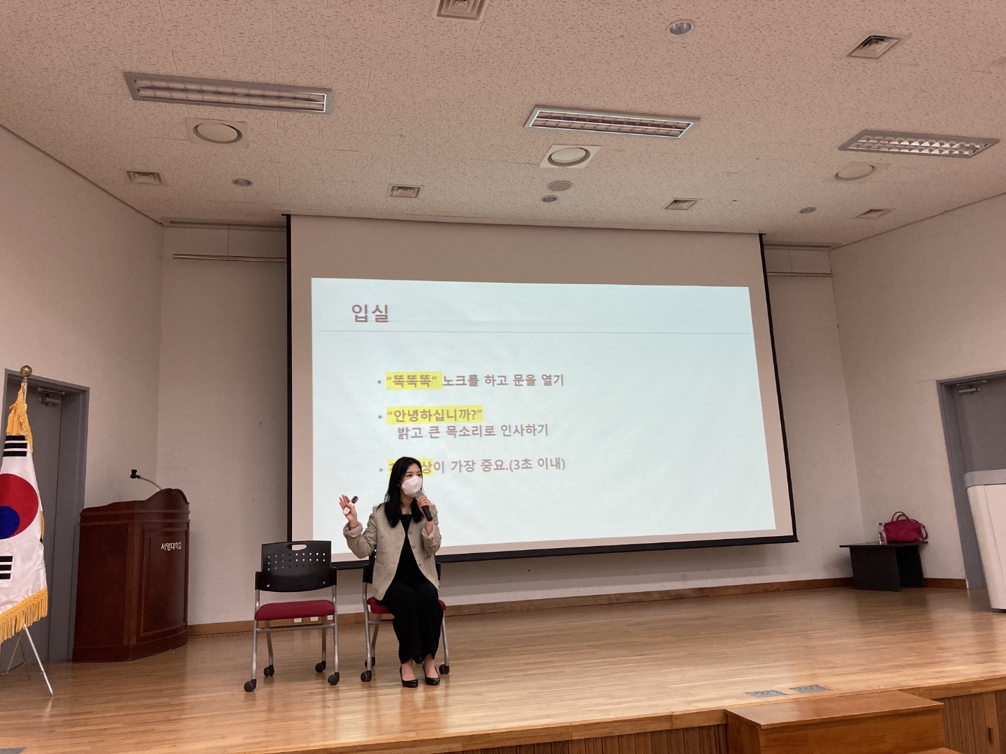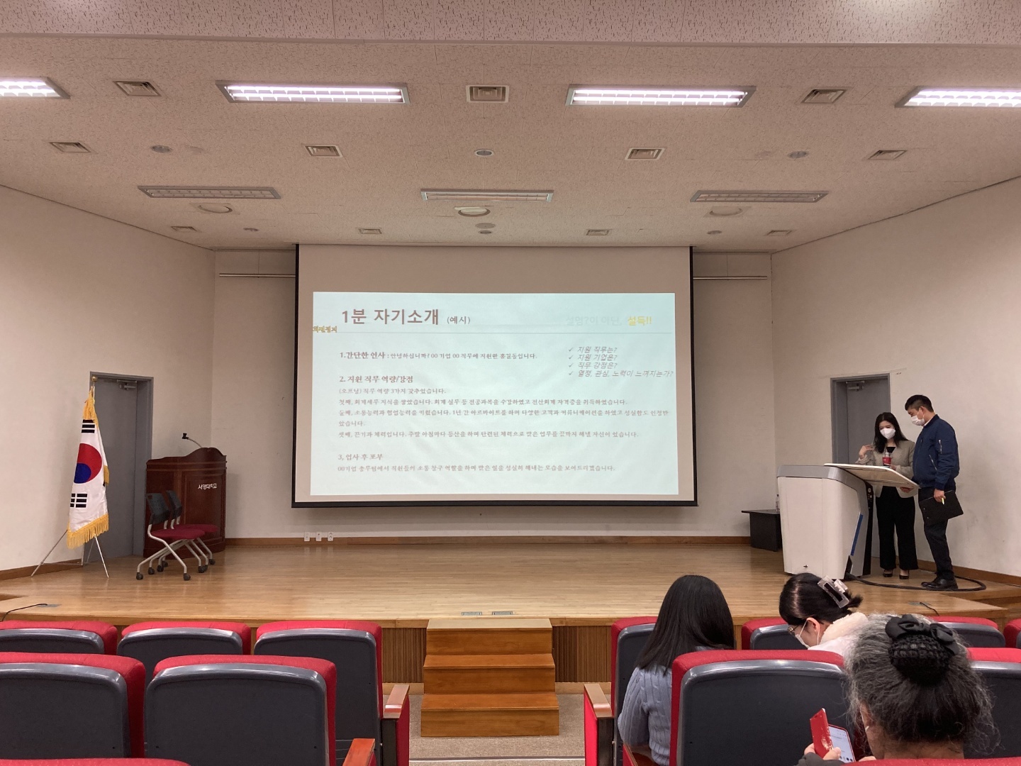 곧 취업을 앞두고 이력서와 면접준비등 걱정이 많은 2학년을 위해 면접시 주의할점, 준비자세, 인재상등에 대한 자세한 설명을 듣고 실제로 연습해보는 시간이었습니다.