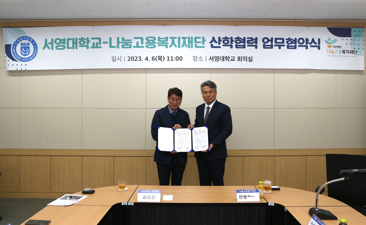 우리대학(총장 김정수)은 사회복지행정과(학과장 김효선)는 4월 6일(목) 나눔고용복지재단(이사장 현명진)과 유기적인 상호협력체계 구축을 위한 업무협약을 체결하였다. 서영대학교 회의실에서 진행된 협약식은 서영대학교 부총장 김순곤, 학생취업처장 김명재, 사회복지행정과 학과장 김효선, 사회복지행정과 권지혜, 김민철 교수 등 서영대학교 관계자와 나눔고용복지재단 이사장 현명진, 이사 전영석, 나눔평생교육원장 손용민, 고산종합사회복지관장 장재임 외 재단 관계자등 총 10여명이 참석하였다.