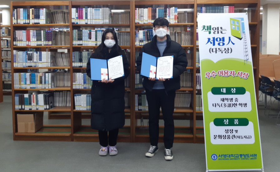 「책 읽는 서영人」 수상자로는 최우수이용자 간호학과 양예원(2), 우수이용자 생명화공과 박지호(1), 성실이용자 간호학과 홍민영(2) 학생이 선정돼 문화상품권을 부상으로 받았다.