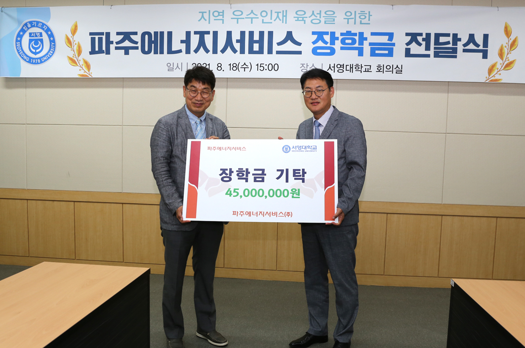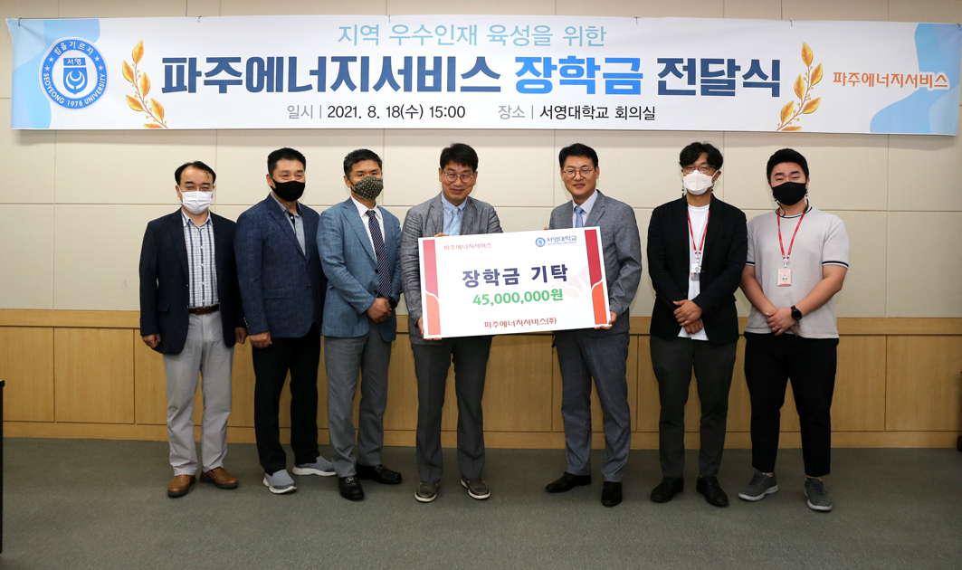 O 장학금 증정식은 양기관이 지역발전과 미래인재양성을 위해 서로 협력하고자 마련된 자리로 유치석 파주에너지 대표님, 김동욱 팀장님, 최성우 매니저님 과 김순곤 서영대학교 부종장님, 임창주 교무처장, 장동민 입학홍보처장, 장철인 학생취업장 등 관계자가 참석하였으며, 파주에너지서비스(주) 에서 일금 4,500만원의 장학금을 서영대학교에 위탁해 주었다.