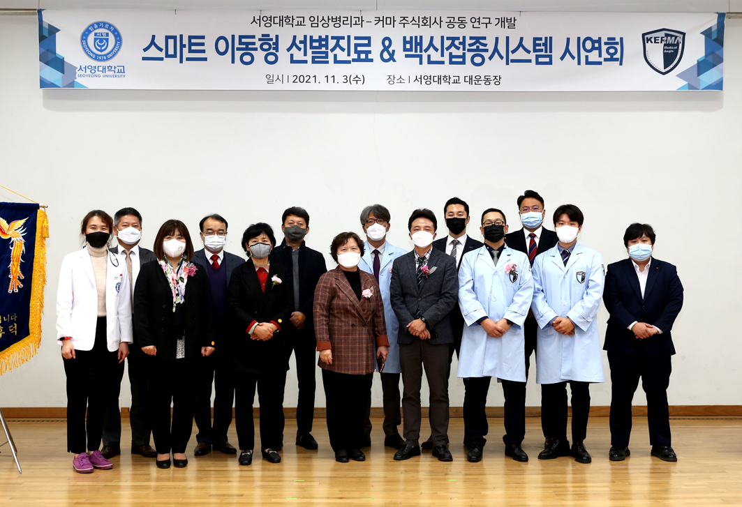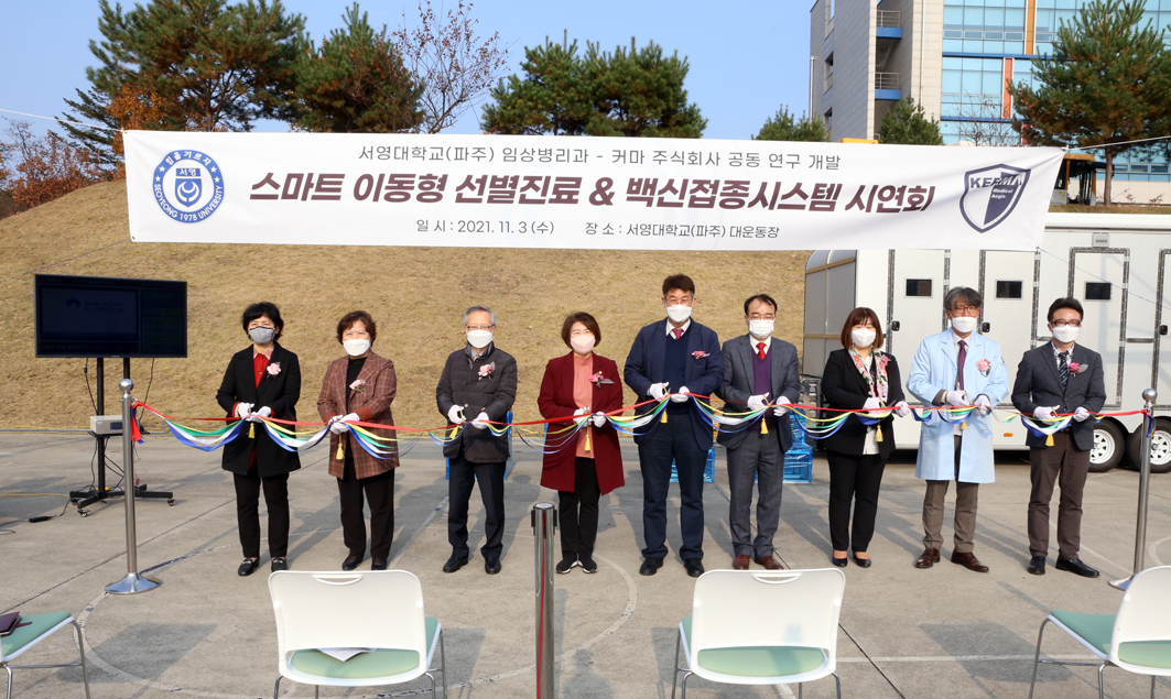 O. 우리대학(총장 김정수) 임상병리과 는 지난 11. 3(수) 서영대학교 운동장에서 서) 임상병리학과(학과장 이지웅)와 커마 주식회사(대표 황복희)가 함께 공동 연구 개발한 “스마트 이동형 선별진료 & 백신접종시스템” 발표시연회를 개최하였다.