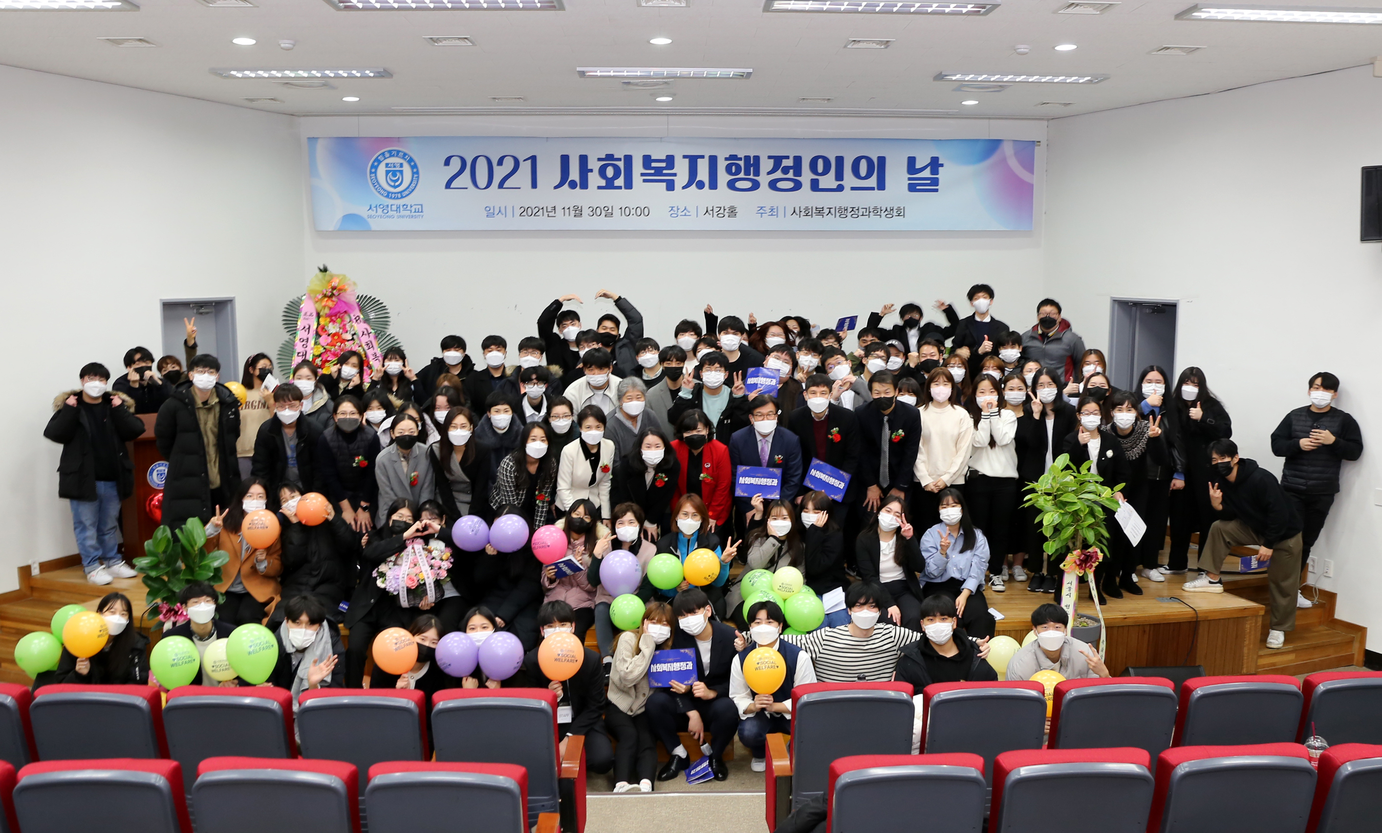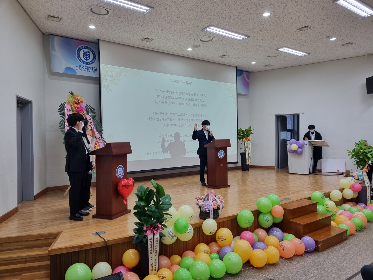 ○ 우리대학 ( 총장 김정수) 사회복지행정과(학과장 김효선교수)는 지난 11월30일 교내에서 "2021년 사회복지행정인의 날" 을 실시하였다. ○ 이번 행사는 사회복지행정과 1,2학년들이 함께 참여하여 장학금 전달식, 사회복지사 선서식, 사회복지사 배지 수여식, 사회복지현장실습 우수 동영상 발표회, 보육실습 우수 시연동영상 발표회, 레크레이션 자격증 수여식, 보드게임지도자 자격증 수여식 등을 진행하였다. ○ 이날 행사에서는 1학년 학생들이 2학년 선배들의 졸업을 축하하는 졸업축하영상을 준비하여 2년간 학교에서의 추억을 나누는 뜻깊은 시간을 가졌다. ○ 김효선 학과장은 “코로나로 인해 사회복지행정인들이 함께 할 수 있는 추억을 갖지 못해 늘 아쉬웠는데 졸업하기 전 축제처럼 진행된 오늘의 행사를 즐겁게 마치게되어 무척 기쁘며, 준비해준 사회복지행정과 학생회 여러분들께 고맙다”는 소감을 전하였다. ○ 사회복지현장실습 우수 동영상 발표회 수상자