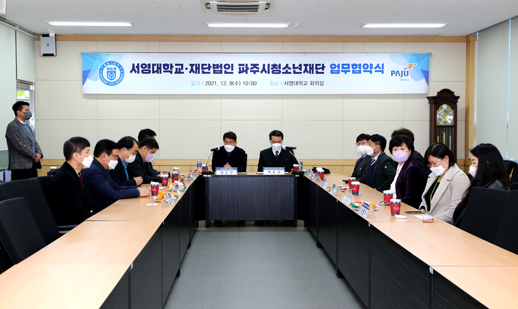 O. 8일 , 서영대학교 파서영대학교 ( 총장 김정수)는 파주시청소년재단 (대표이사 박준규)와 김순곤 서영대학교 부총장, 장동민 입학홍보처장, 임창주 교무처장, 장철인 학생취업처장, 박준규 파주시청소년재단 대표이사, 박종훈 정책기획과장, 김형수 청소년활동과장 등 20명의 관계자가 참석하여 양기관 간 협력을 통해 파주시 청소년의 공공복리 증진을 위한 업무협약 체결을 진행 하였다.