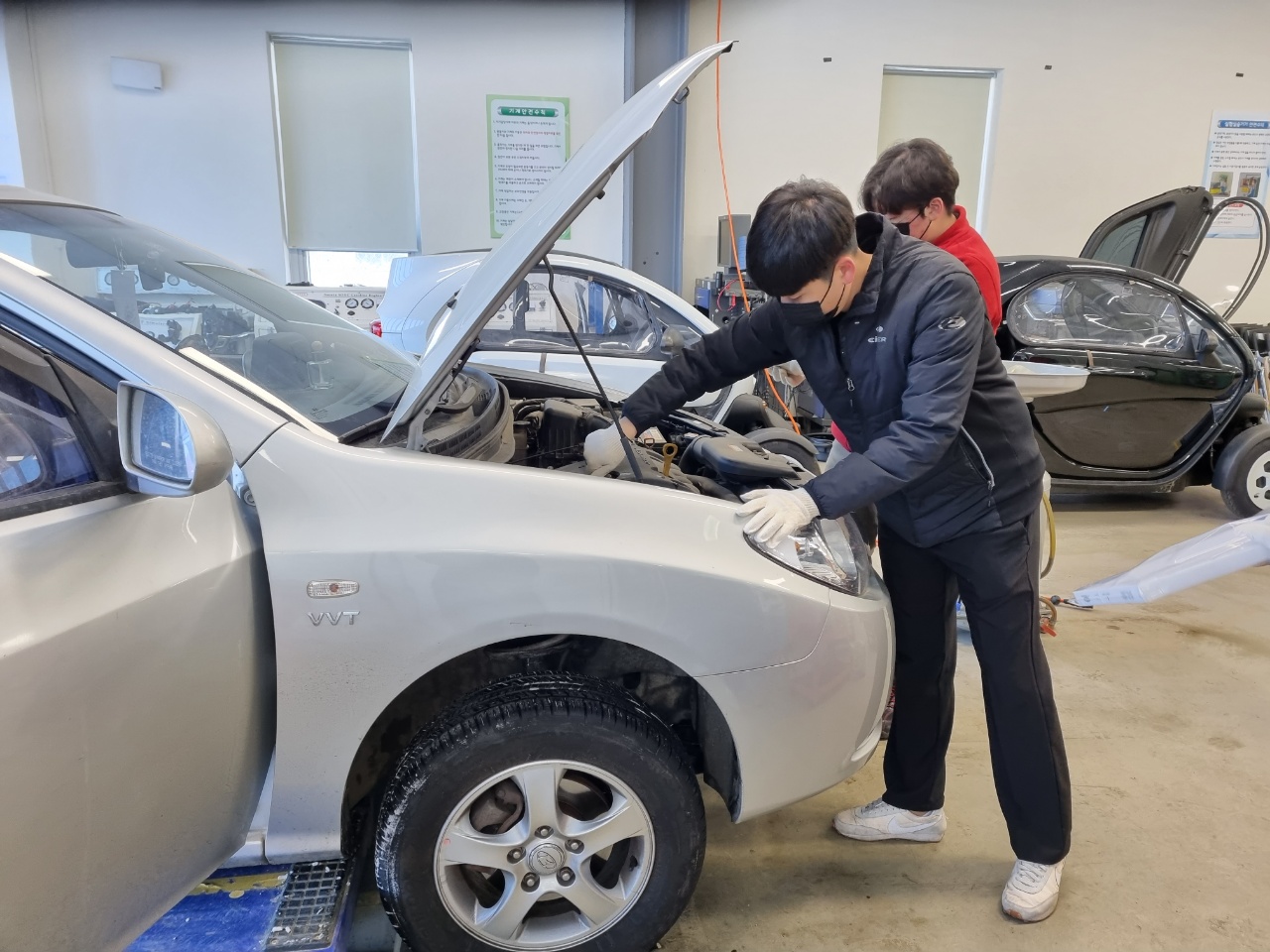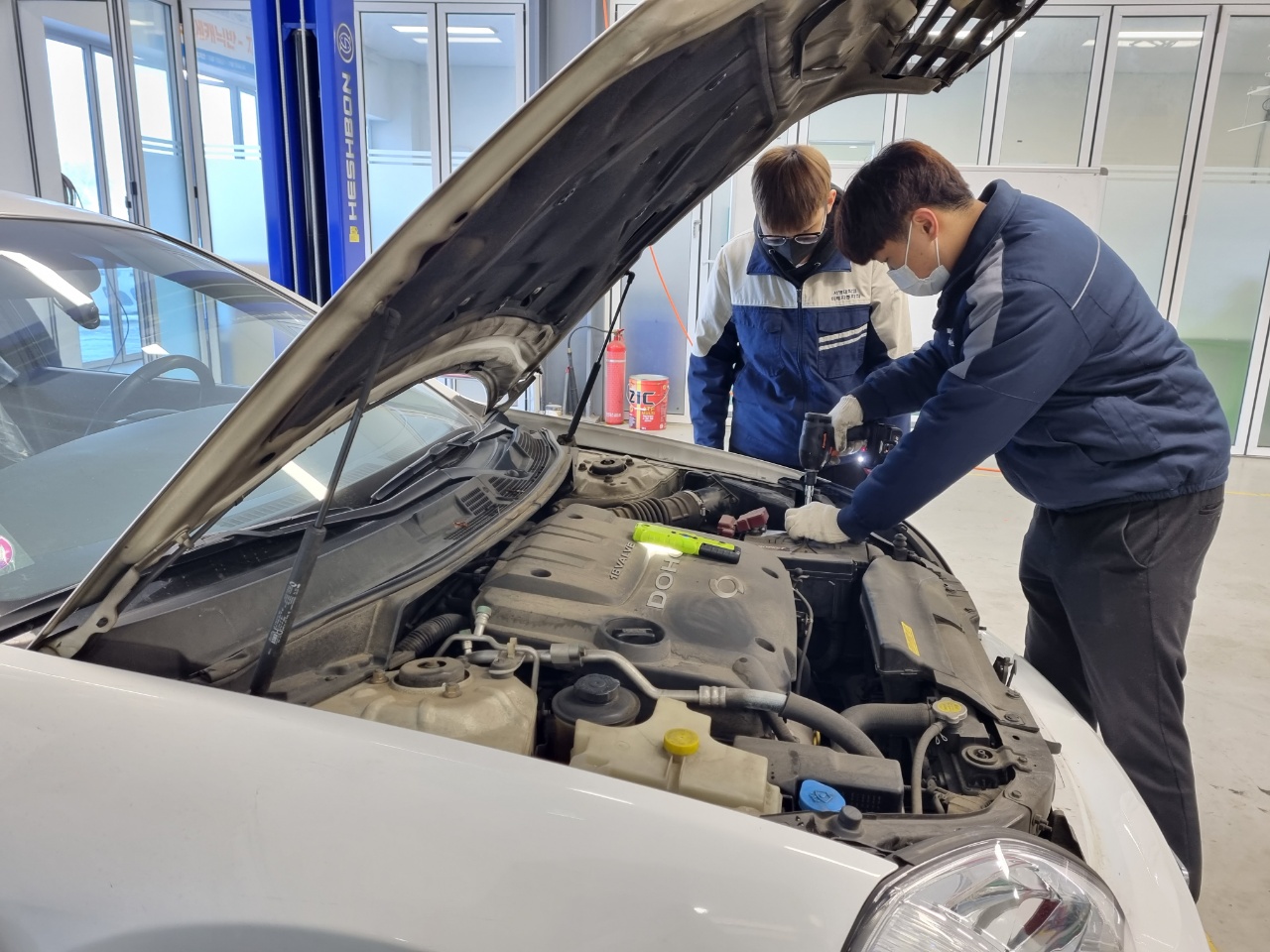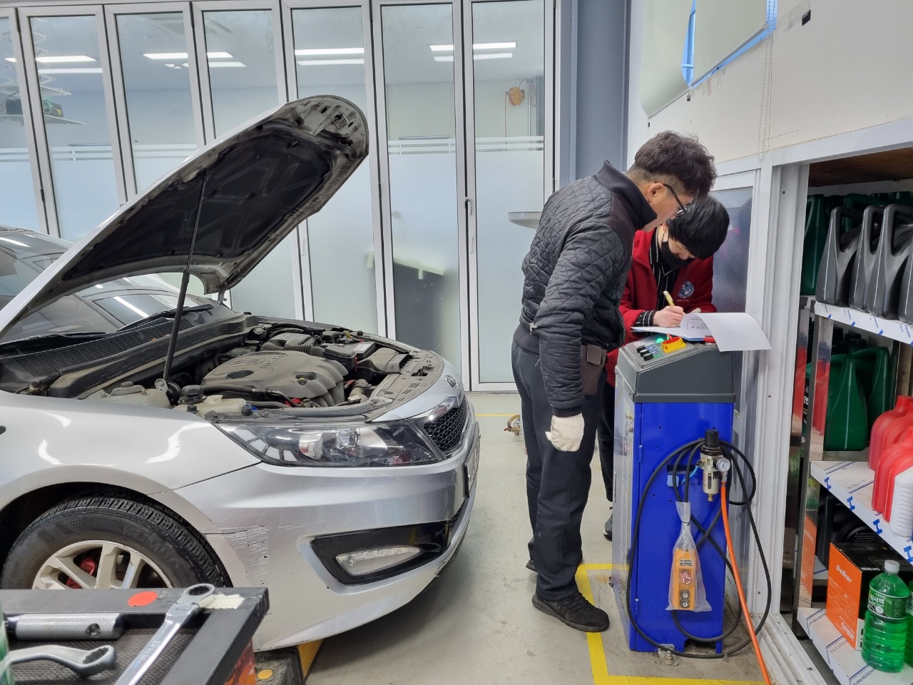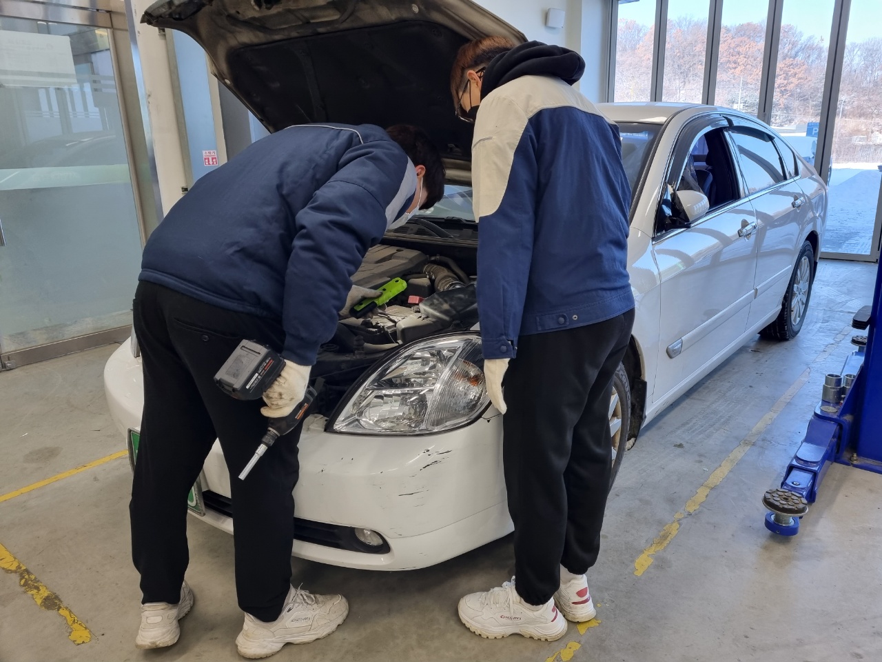 ◯ 경제적 어려움을 덜어주기 위해 진행한 이번 점검에서는 미래자동차과 실습실 기자재를 활용해 기본적인 안전점검은 물론 안전과 직결되는 배터리, 타이어, 엔진, 냉각수, 연료필터, 라이닝을 비롯한 각종 오일류를 정상치로 보충해 주는 등의 정비활동을 실시하였다.