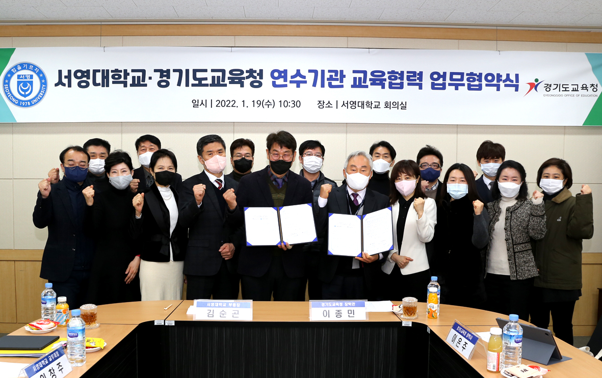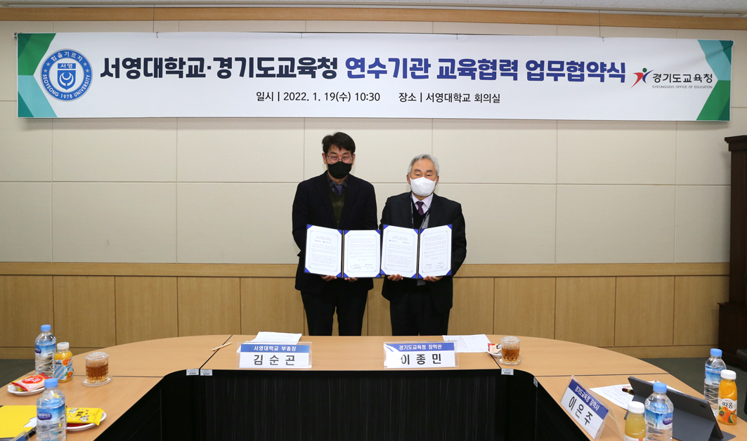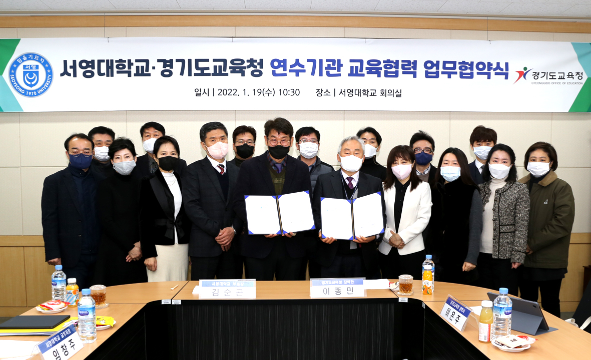 O. 서영대학교(총장 김정수) 는 경기도교육청(교육감 이재정)과 1월 9일 경기도 지역 교원연수기관 교육협력 실무 논의를 위한 교원연수기관 업무협약서 전달 및 간담회를 가졌다. 이번 업무협약서 교환 및 간담회는 서영대학교가 경기 북부지역 교원들의 전문 연수기관으로 충실한 역할을 수행하기위해 마련되었다. 경기도 교육청 이종민 장학관님, 이은주 장학사님, 송수용장학사님 및 김순곤 서영대학교 부총장, 임창주 교부처장, 장동민 입학홍보처장, 장철인 학생취업처장외 연수프로그램 참여 학과 학과장 등 관계자 30여명이 참석하였다.