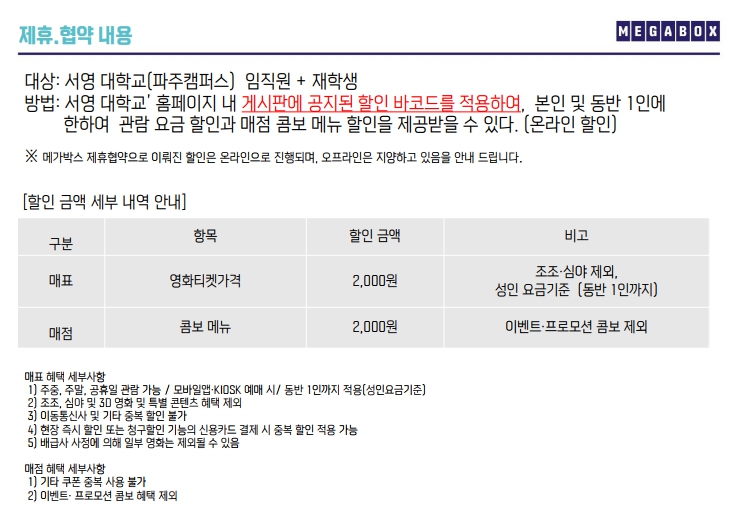 O. 메가박스 영화관의 서부그룹 ( 고양 스타필드점, 김포한강도시점, 백석점, 부천스타필드점, 송도점, 일산 벨라시타점, 킨텍스점 ) 8개 영화관에서 영화 관람 할인 및 콤보메뉴 할인 등 다양한 혜택을 제공한다.
