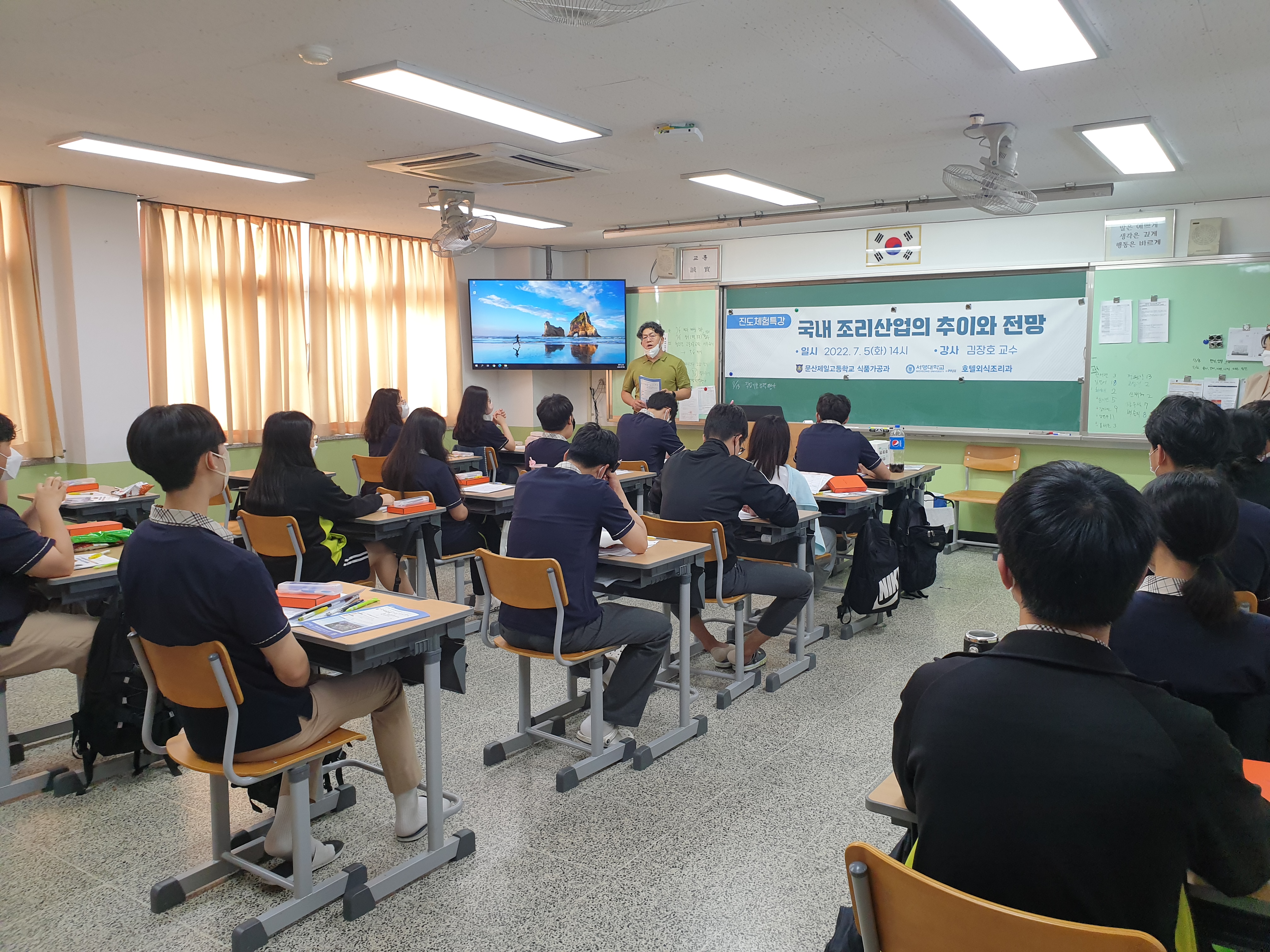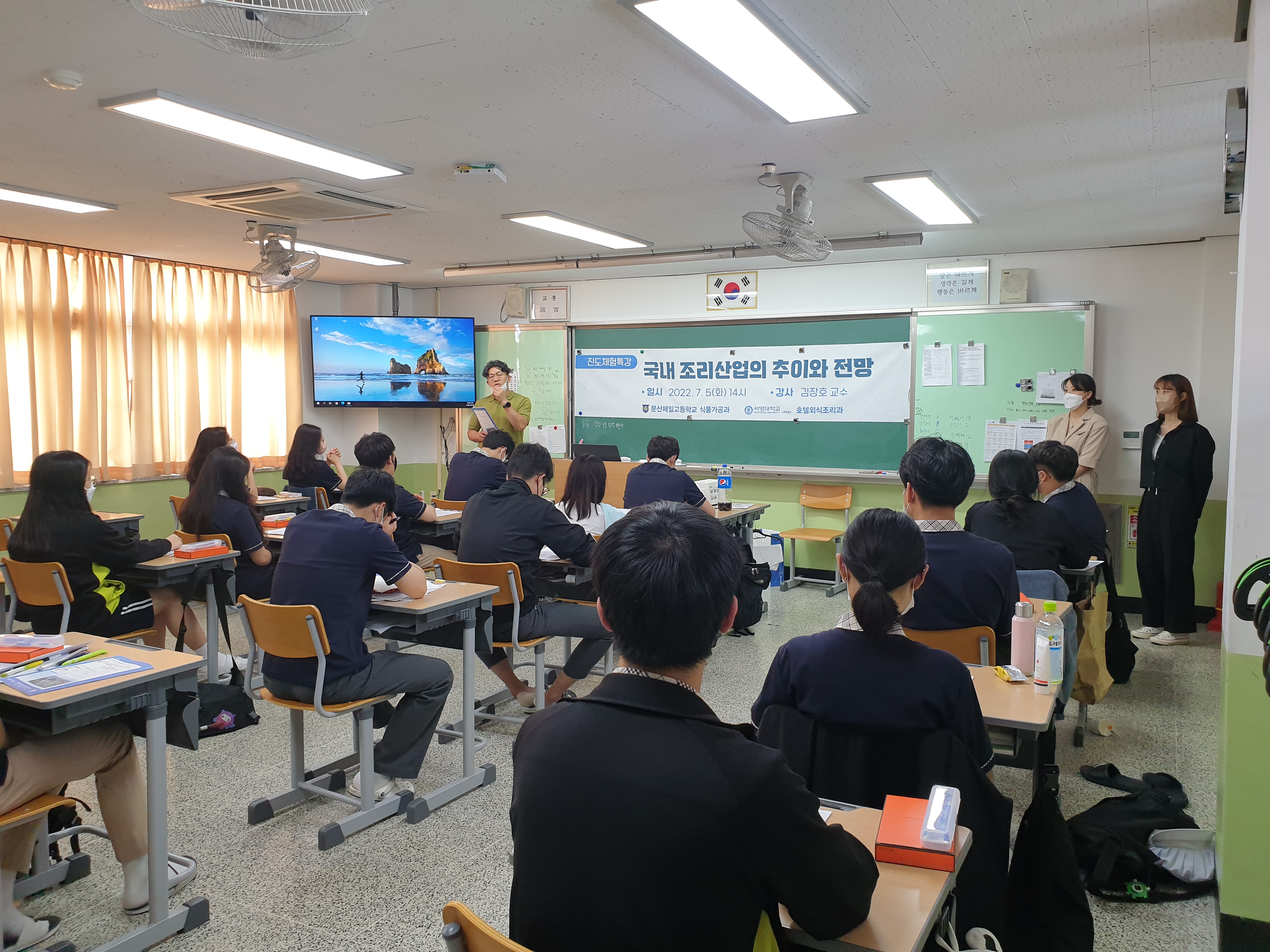 O. 우리대학(총장 김정수 ) 호텔외식조리과 (학과장 김장호 교수)는 7월 5일 문산제일고등학교 식품가공과 3학년 학생들을 대상으로 진로체험특강 프로그램에 초청을 받아 “국내 조리산업의 추이와 전망” 이라는 주제로 재능기부 형식의 특강을 실시하였다.