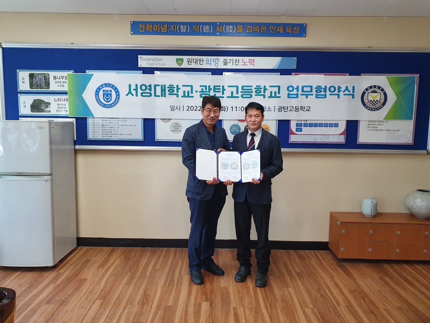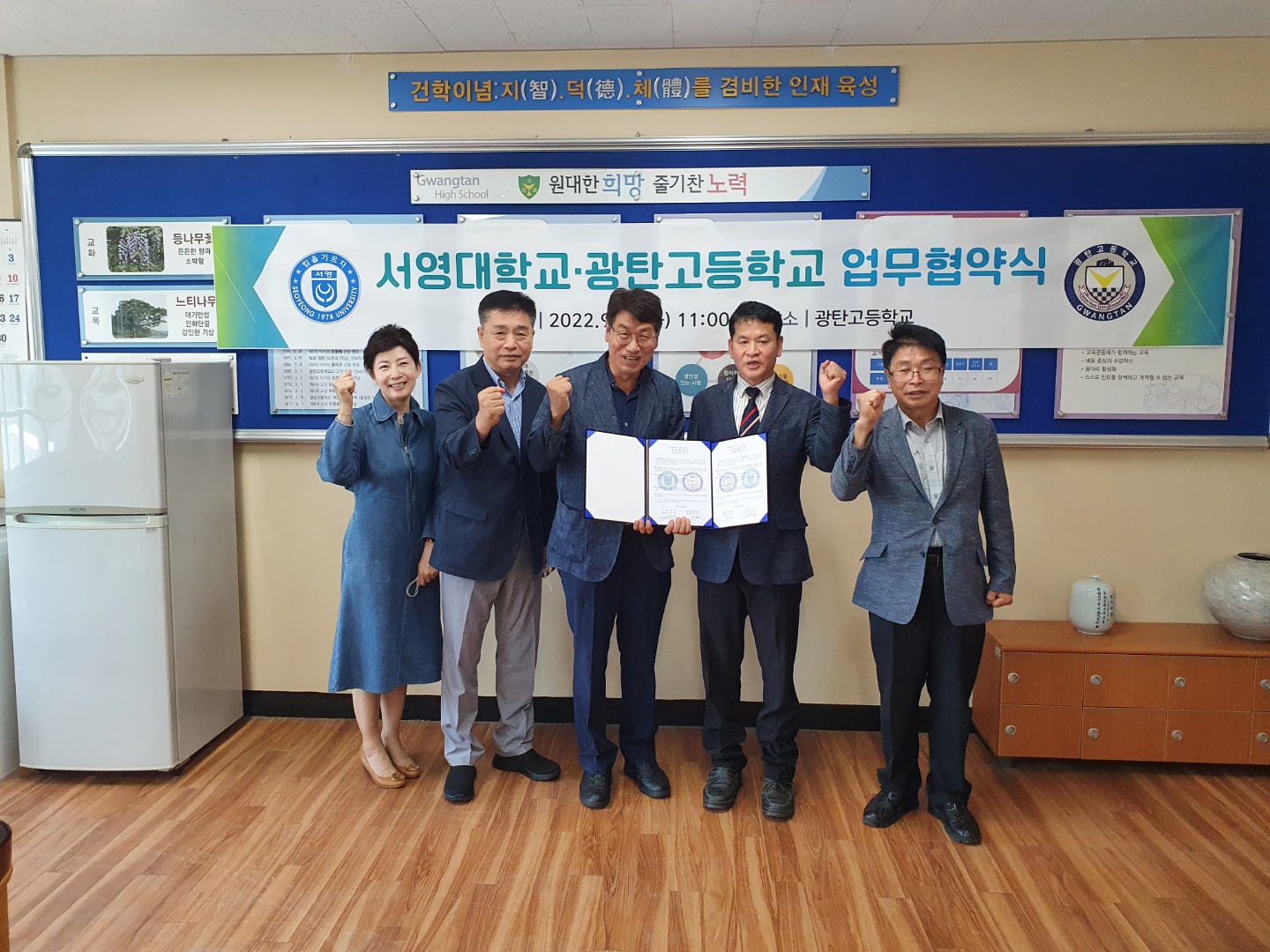 O 우리대학(총장 김정수)은 광탄고등학교 (교장 박홍근)와 27일(화) 광탄고등학교 교장실에서 지역발전과 미래인재육성을 위해 상호협력 업무협약 체결을 진행 하였다. 이 날 협약식은 김순곤 서영대학교 부총장님, 장동민 입학홍보처창님 , 최선아 뷰티아트과 학과장 등 서영대학교 관계자와 박홍근 광탄고등학교 교장선생님, 3학년 진학부장님 등 광탄고등학교 관계자 등 10명의 관계자가 참석하였다.