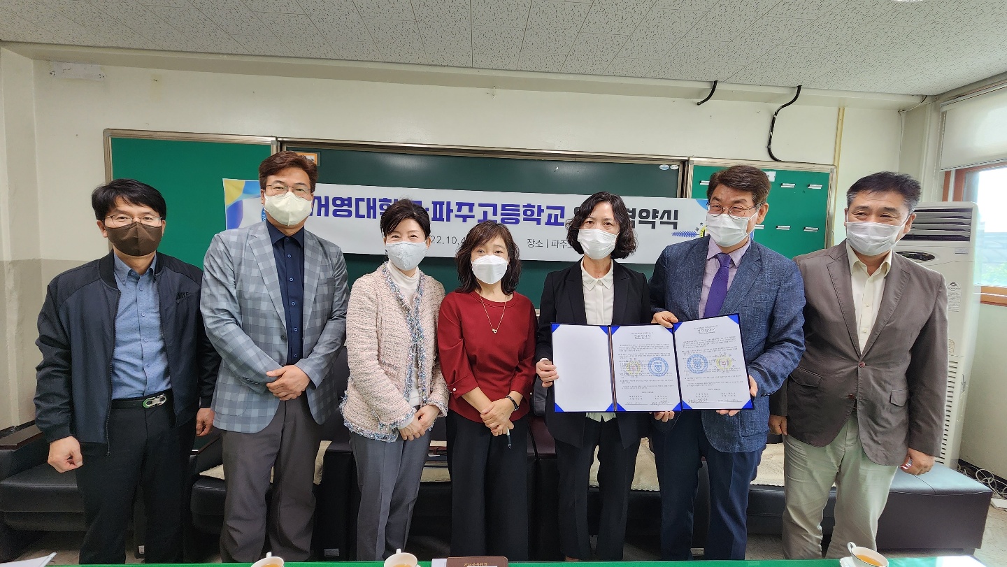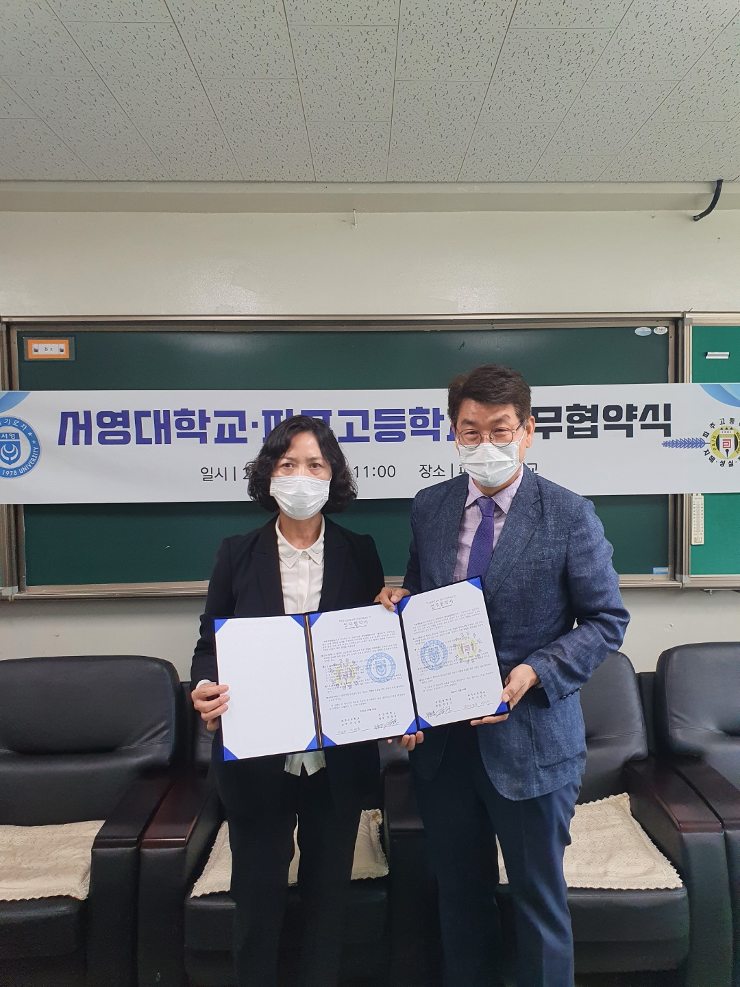 O 우리대학(총장 김정수)은 파주고등학교 (교장 이인숙)와 4일(화) 파주고등학교에서 지역발전과 미래인재육성을 위해 상호협력 업무협약 체결을 진행 하였다. 이 날 협약식은 김순곤 서영대학교 부총장, 장동민 입학홍보처창 , 최선아 뷰티아트과 학과장, 봉필준 미래자동차과 학과장 등 서영대학교 관계자와 이인숙 파주고등학교 교장선생님, 3학년 진학부장님 등 파주고등학교 관계자 등 10명의 관계자가 참석하였다.