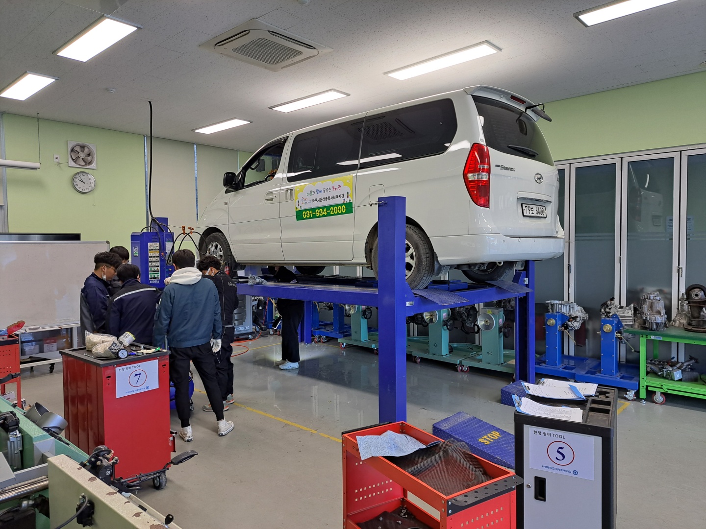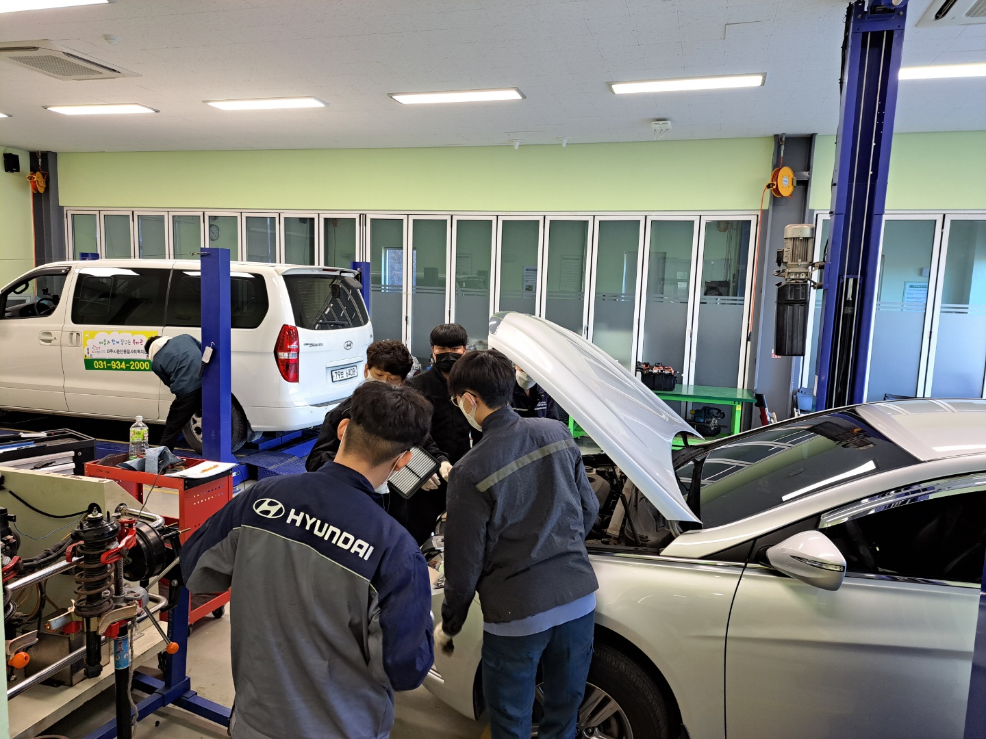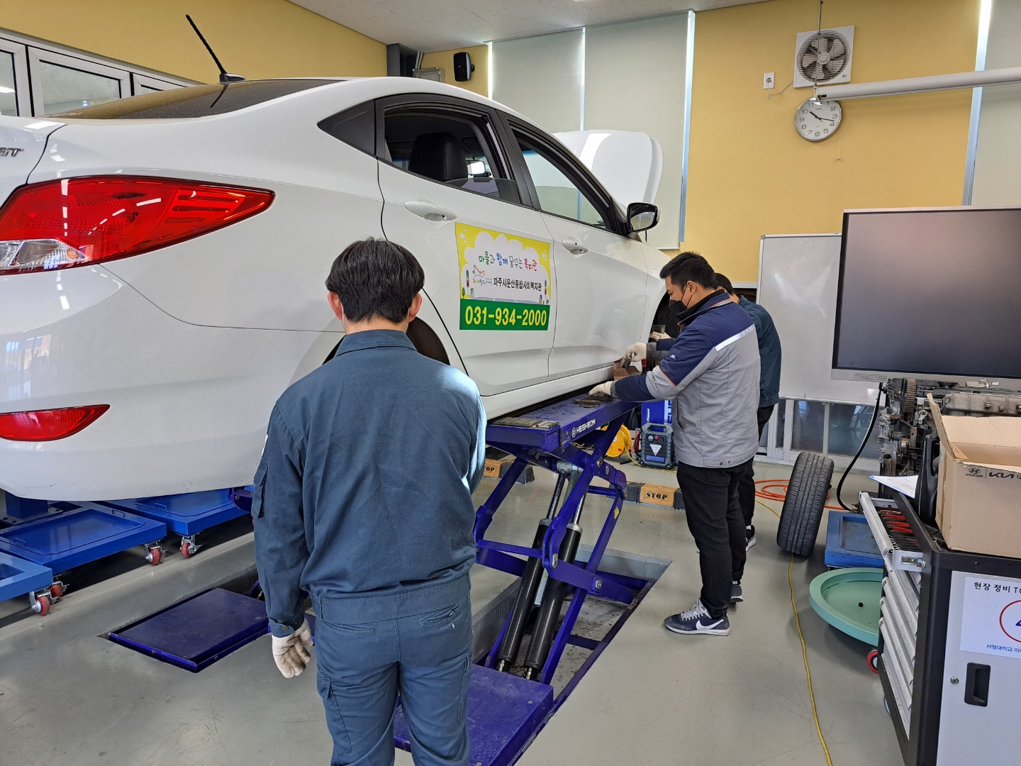 O. 문산사회복지관 및 장애인지원센터 협조를 통해 복지관 등에서 운영 중인 공영 차량 및 지역주민들의 차량을 사전에 신청 받아 20여 가지 동절기 대비 무상점검, 타이어 로테이션 등의 기본 안전 작업 및 엔진오일, 와이퍼 블레이드, 브레이크 패드 등 학교의 지원을 받아 무상으로 부품 지원을 통해 자동차정비를 시행하였다.