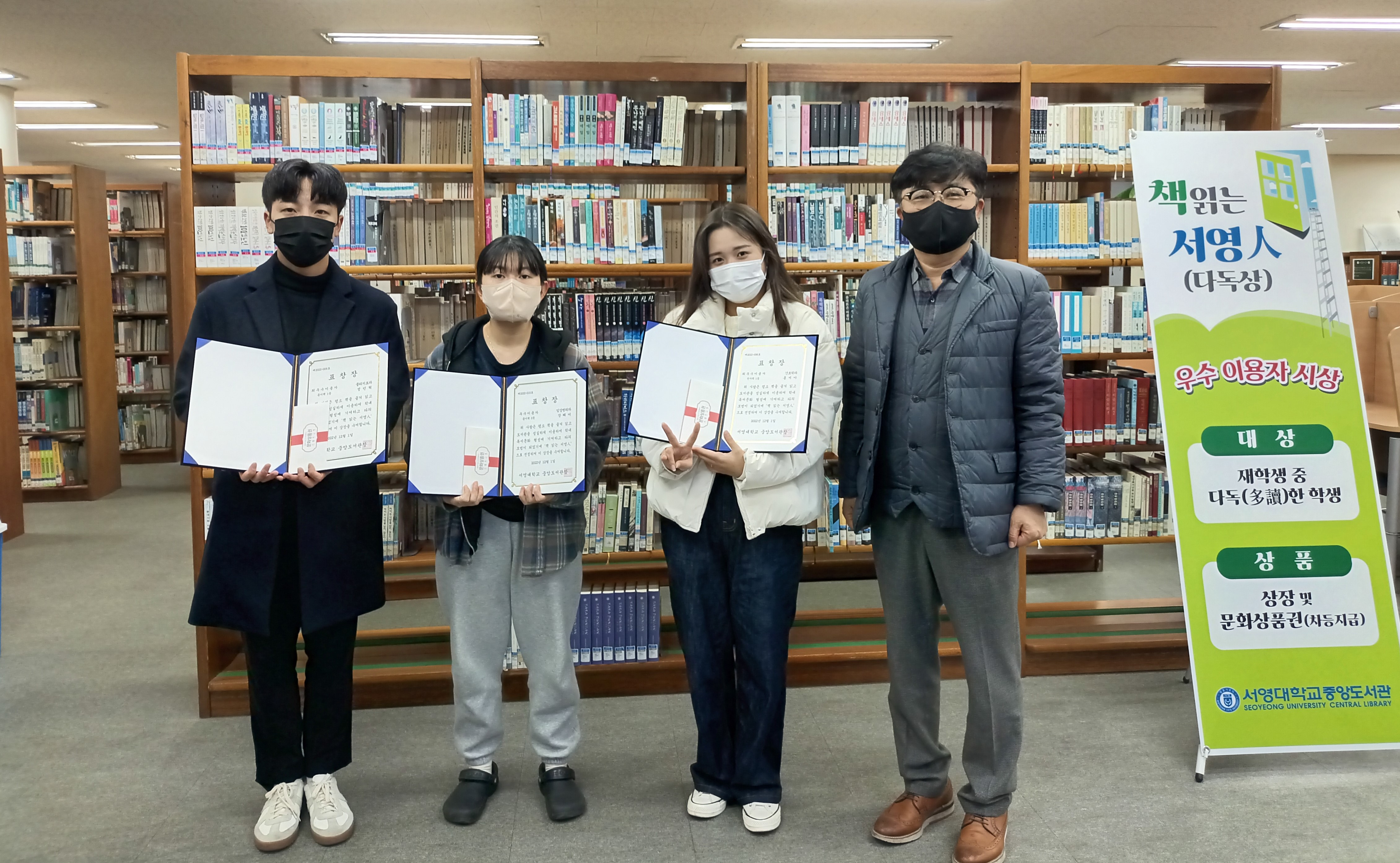 ○ 「책 읽는 서영人」 수상자로는 종이책 최우수이용자 물리치료과 정민혁(2), 우수이용자 임상병리과 장혜미(3), 간호학과 양예은(4), 전자책 최우수이용자 간호학과 홍서아(4) 학생이 선정되었으며 문화상품권을 부상으로 받았다.