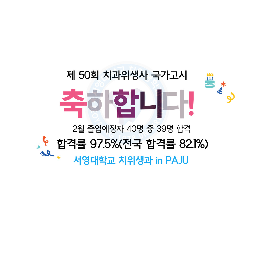 O.우리대학(총장 김정수) 치위생과 (학과장 이명선 교수)는 제 50회 치과위생사 국가고시에서 치위생과 3학년 40명 전원이 국가고시에 응시하여, 그 중 39명이 최종 합격해 97.5%라는 우수한 합격률을 보였다.