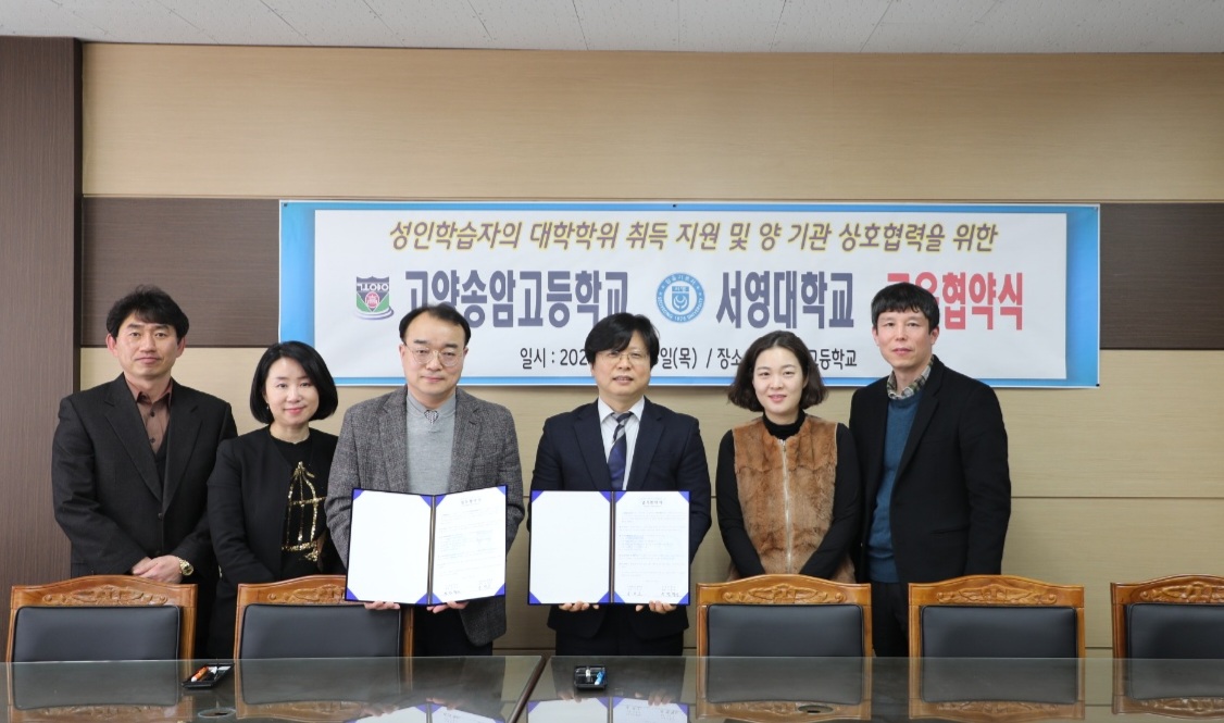 O 우리대학(총장 김정수)은 고양송암고등학교(교장 정재도)와 지난 2월 23일(목), 고양송암고등학교에서 지역사회발전과 미래인재육성을 위한 상호협력 업무협약 체결을 진행하였다. 이 날 협약식은 장철인 서영대학교 입학홍보처장, 김명재 학생취업처장, 김효선 사회복지행정과 학과장, 김용철 사회복지행정과 교수 등 서영대학교 관계자와 정재도 고양송암고등학교 교장선생님 외 학교 관계자 등 10여명의 관계자가 참석하였다.