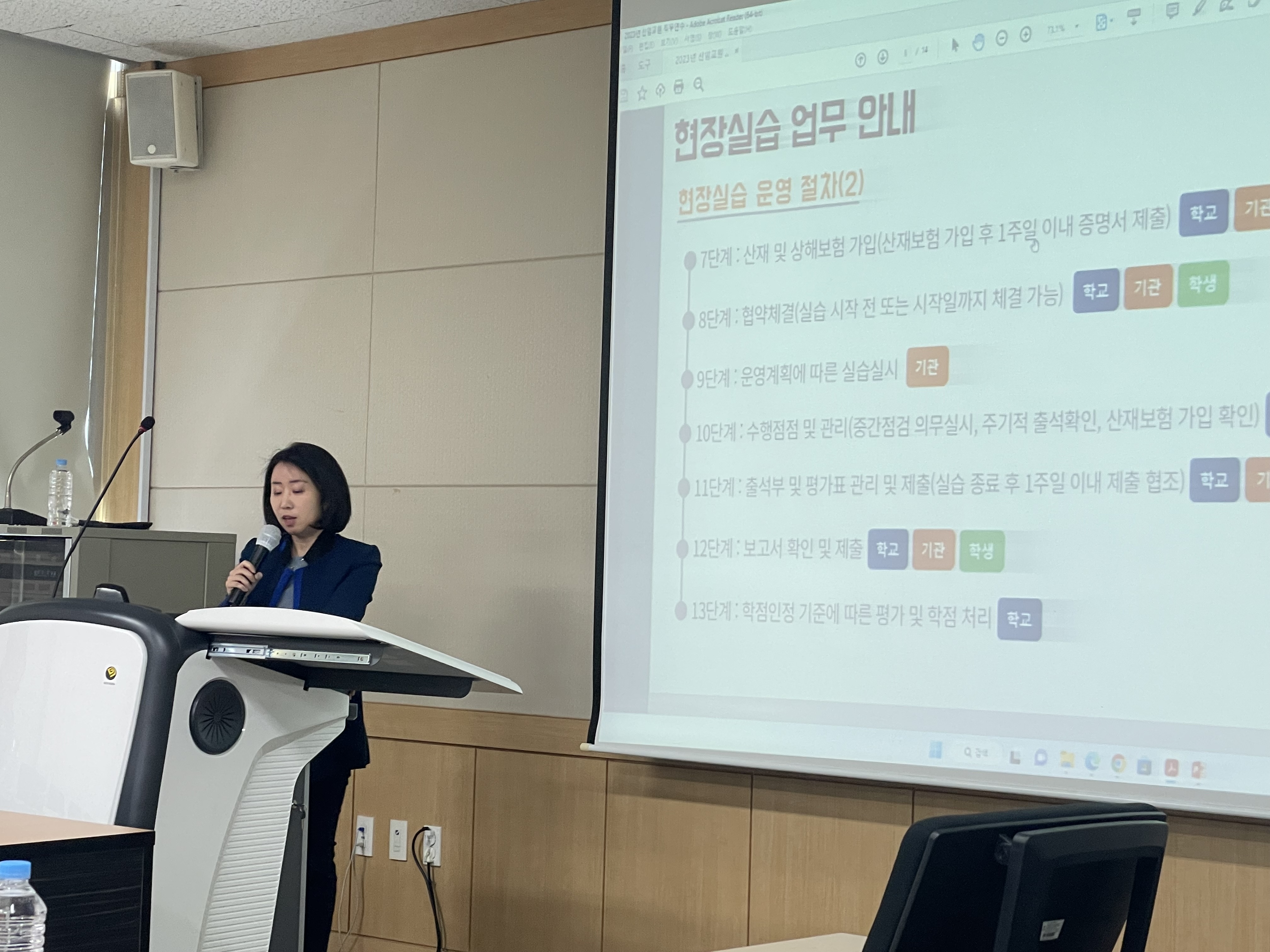O. 우리대학(총장 김정수)은 3월 24일(금) 신임교원의 직무능력 향상을 위한 직무교육을 실시하였다. 서정관 1층 회의실에서 진행된 신임교원 직무교육은 부총장 김순곤, 입학홍보처장 장철인, 교무처장 임창주, 학생취업처장 김명재 이하 각 부처별 실무담당자 4인과 미래자동차과 김진태교수 외 신임교원 6인이 참석하였다.