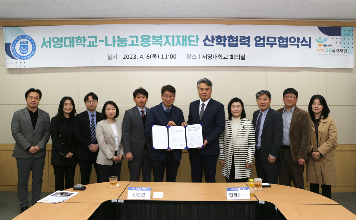 O. 서영대학교 회의실에서 진행된 협약식은 서영대학교 부총장 김순곤, 학생취업처장 김명재, 사회복지행정과 학과장 김효선, 사회복지행정과 권지혜, 김민철 교수 등 서영대학교 관계자와 나눔고용복지재단 이사장 현명진, 이사 전영석, 나눔평생교육원장 손용민, 고산종합사회복지관장 장재임 외 재단 관계자등 총 10여명이 참석하였다.
