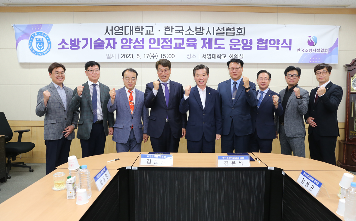 O. 우리대학(총장 김정수)은 5월17일(수) 한국소방시설협회(회장 김은식)와 유기적인 상호 협력 체계 구축을 위한 협약을 체결하였다. 서영대학교 회의실에서 진행된 협약식은 서영대학교 부총장 김순곤, 입학홍보처장 장철인, 소방안전과 학과장 천종철 외 서영대학교 관계자와 한국소방시설협회 회장 김은식 외 한국소방시설협회 관계자가 참석하였다.