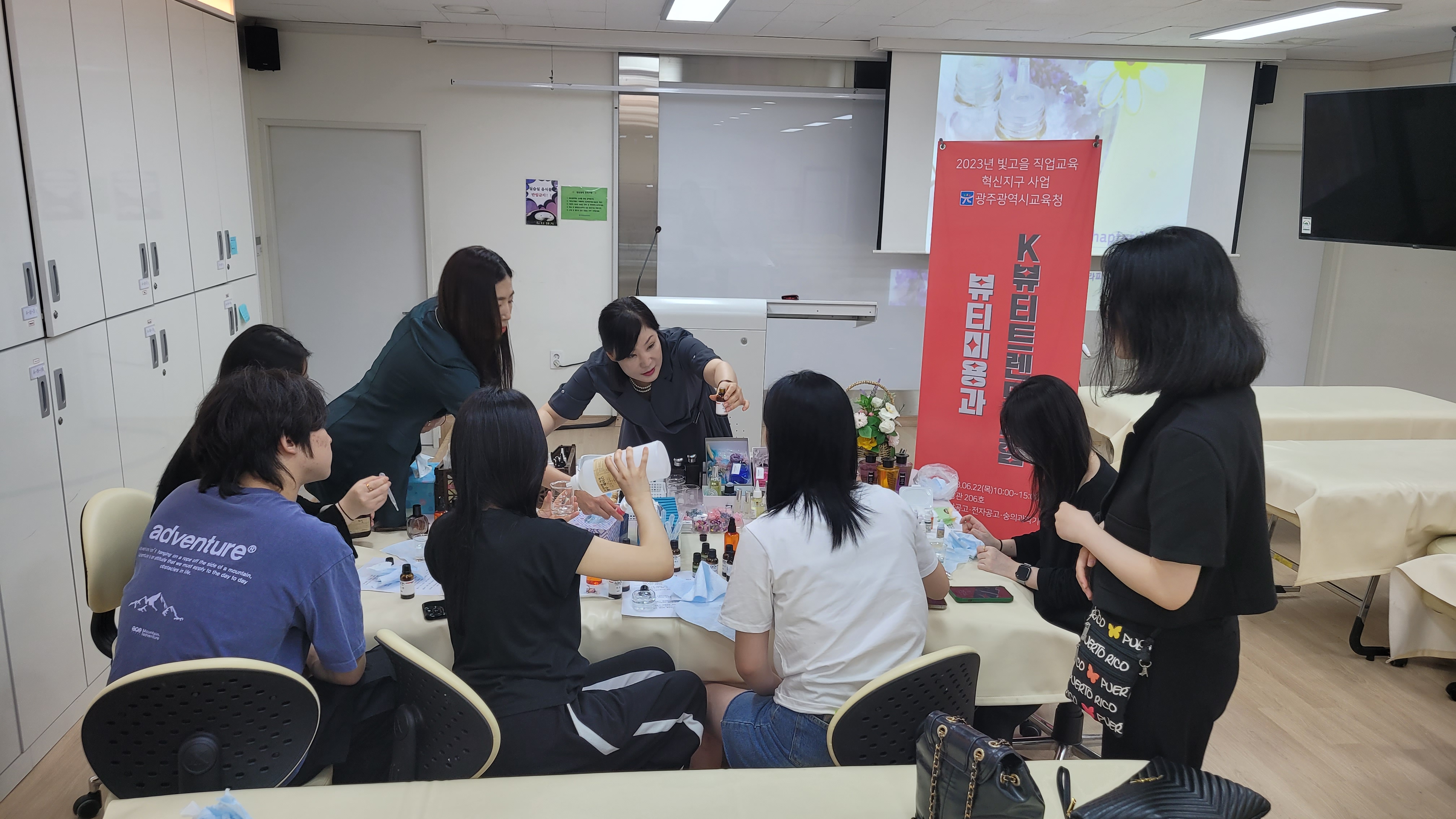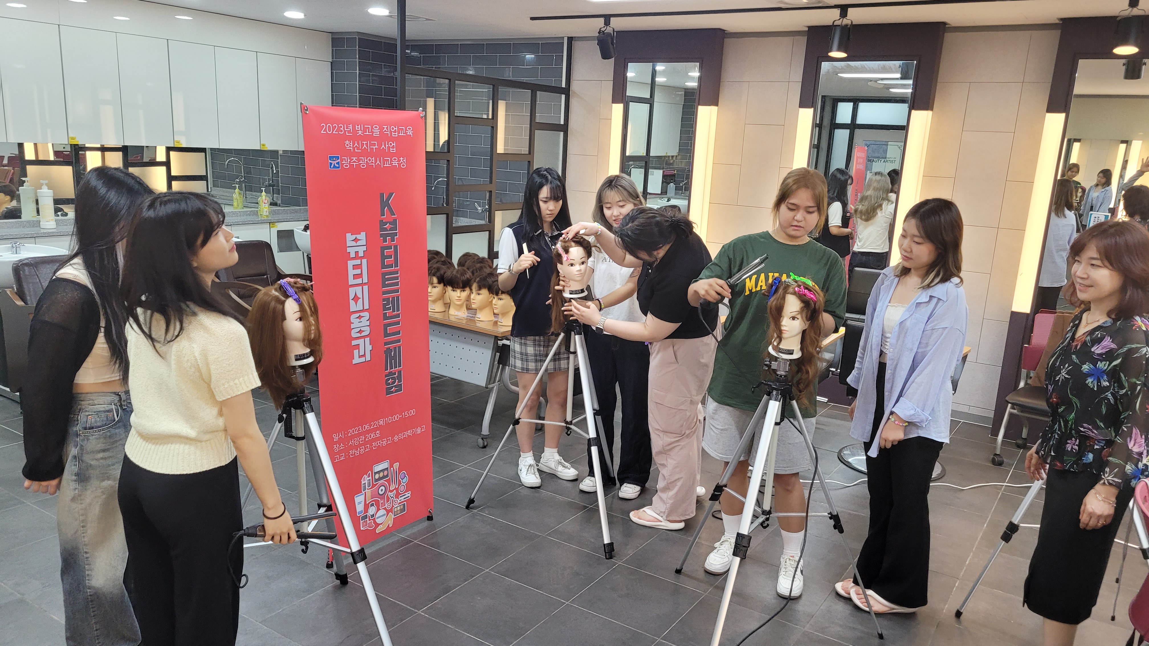 ○ 우리대학이 광주시와 광주시교육청이 주관하는 ‘2023년 빛고을 직업교육 혁신지구 사업’의 일환으로 전남공고, 광주전자공고, 금파공고 등에 재학 중인 11명의 취업동아리 학생들을 대상으로 K-뷰티트랜드 체험교육을 실시했다.