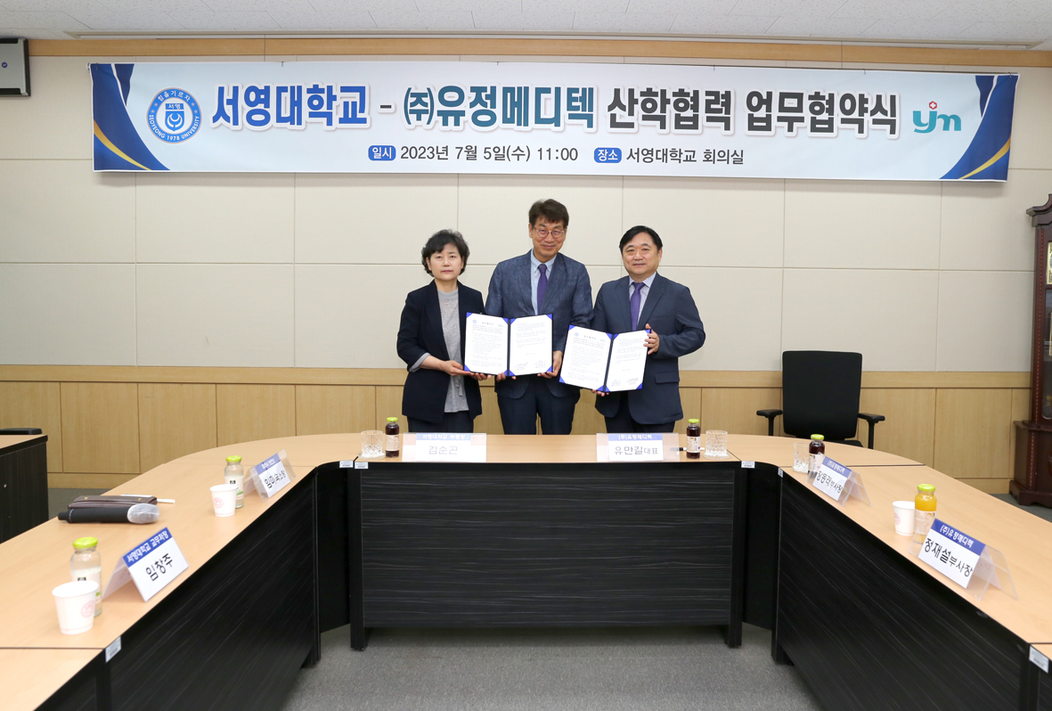 O. 우리대학(총장 김정수)은 6월5일(수) ㈜유정메디텍과 보건전문인력 양성과 바이오 생물테러대응 협업을 위한 업무협약을 체결했다. 서영대학교 회의실에서 진행된 협약식에는 서영대학교 부총장 김순곤, 입학홍보처장 장철인 외 각 부처 처장단과 임상병리과 학과장 이지웅 및 학과교수를 비롯한 관계자와 유정메디텍 대표 유만길, 파주시 보건소장 임미숙, 파주타임즈 대표이사 윤관호 외 업무관계자가 참석하였다. O. 상호 협력 체계 구축을 위한 주요 협약 내용은 다음과 같다. 참여기업과 서영대 보건계열 학생 간의 의료기기 제품개발, 우수 의료인력 양성을 위한 프로그램 개발, 교수 현장 연수 및 학생 현장실습 지원, 산·학간 우수 인력 우선 공급, 실무 위주의 교육과정 및 학습교재 공동개발 등에 관한 사항이다. O. 이날 진행된 협약식에서는 ㈜유정메디텍에서 DOA 마약 진단 키트, 말라리아 진단 키트, 바이오 생물테러 관련 진단 키트, 체외진단기기 등을 임상병리과에 전달하는 기증식도 함께 진행되었다. 임상병리과에서는 이를 활용하여 기생충 및 혈액학 실습 교과목을 통해 말라리아 신속 진단 실무를 학습하고, 법의학 교과목을 통해 현재 많은 이슈가 되고 있는 마약 진단 검사에 대한 심도 있는 수업을 진행할 예정이다. O. 서영대학교 김순곤 부총장은 “서영대학교가 보건 특성화 교육기관으로서 헬스케어 분야를 선도하는 유정메디텍과의 업무협약을 통해 양 기관의 발전과 보건의료 및 관련 전문 연구 인력을 제공할 수 있는 기반을 확립하게 되어 기쁘게 생각한다”고 말했다. 이에 ㈜유정메디텍 유만길 대표는 “보건의료 분야에 아낌없이 투자하는 서영대학교와 협력하여 학생 현장실습 지원과 교육프로그램 공동 개발을 통해 우수한 보건의료 인력을 확보하고, 지식과 기술 교류를 통해 바이오 생물테러대응 및 지역사회 보건의료분야정책에 기여하고자 지속적인 교류 협력에 최선을 다할 것이다”고 말했다. 더불어 서영대학교 이지웅 임상병리학과장은 “현재 대부분의 의료기관 및 연구소에서 다수의 임상병리 전공자들이 각종 감염병 진단업무 및 바이오 생물테러대응 분야에서 종사하고 있는 상황이다. 오늘 진행된 유정메디텍과의 지속적인 협력으로 향후 R&D 분야에서도 주도적인 역할을 할 수 있는 인재양성을 위해 최선을 다할 것이다”라고 말하였다.