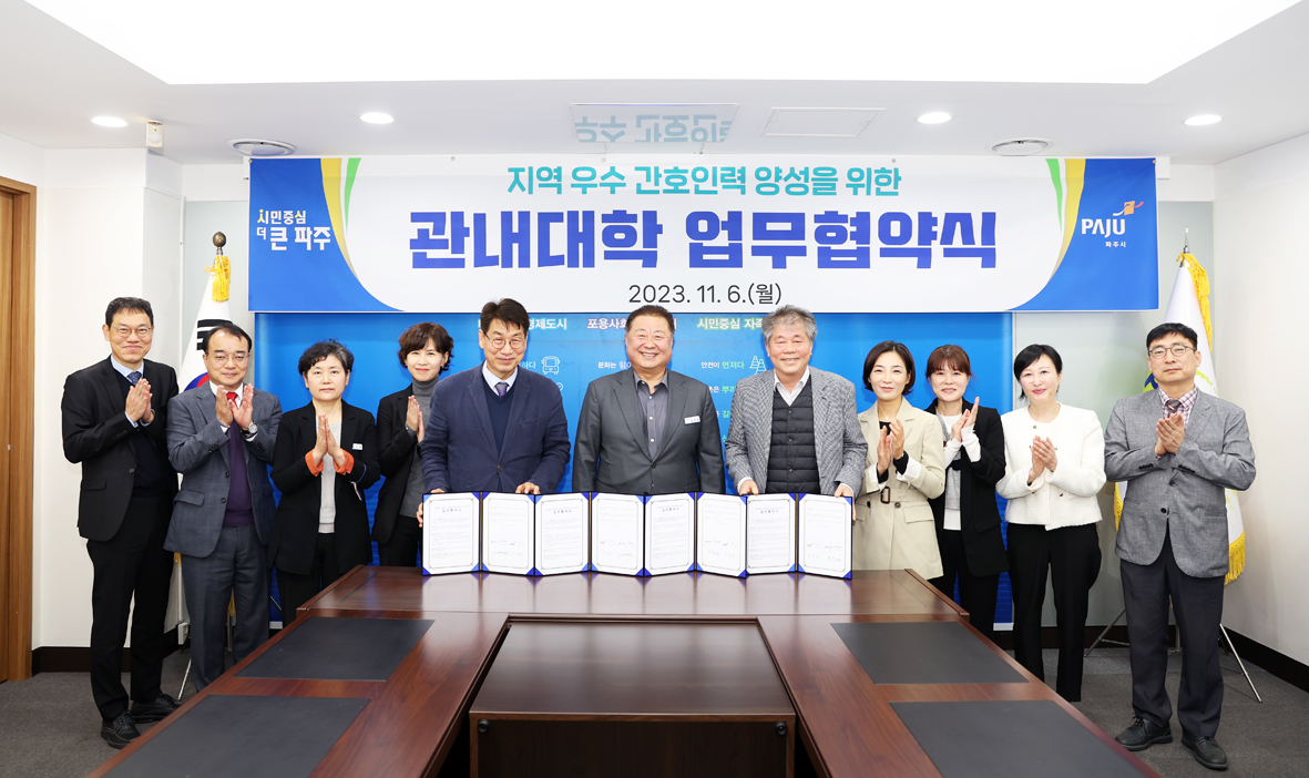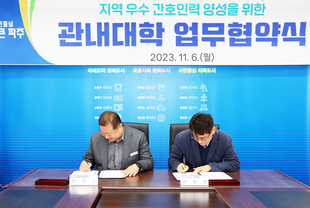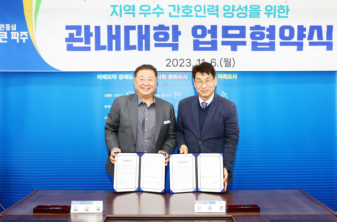O. 우리대학(총장 김정수)은 11월 6일(월) 파주시(시장 김경일)와 서영대학교 파주캠퍼스 간호학과 분리모집 및 운영추진을 위한 업무협약을 체결하였다. 파주시청에서 진행된 업무협약식에는 서영대학교 부총장 김순곤, 입학처장 장철인 외 서영대학교 관계자와 파주시장 김경일 외 파주시청 관계자가 참석하였다.