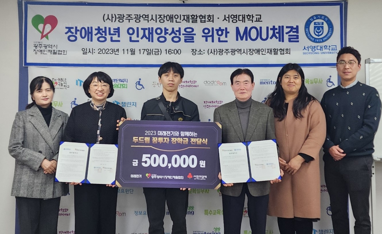 ○ 한편 이날 광주광역시장애인재활협회는 서영대 AI미래자동차과 재학생 1명에게 ‘두드림 꿈투자 장학금’을 전달했다.
