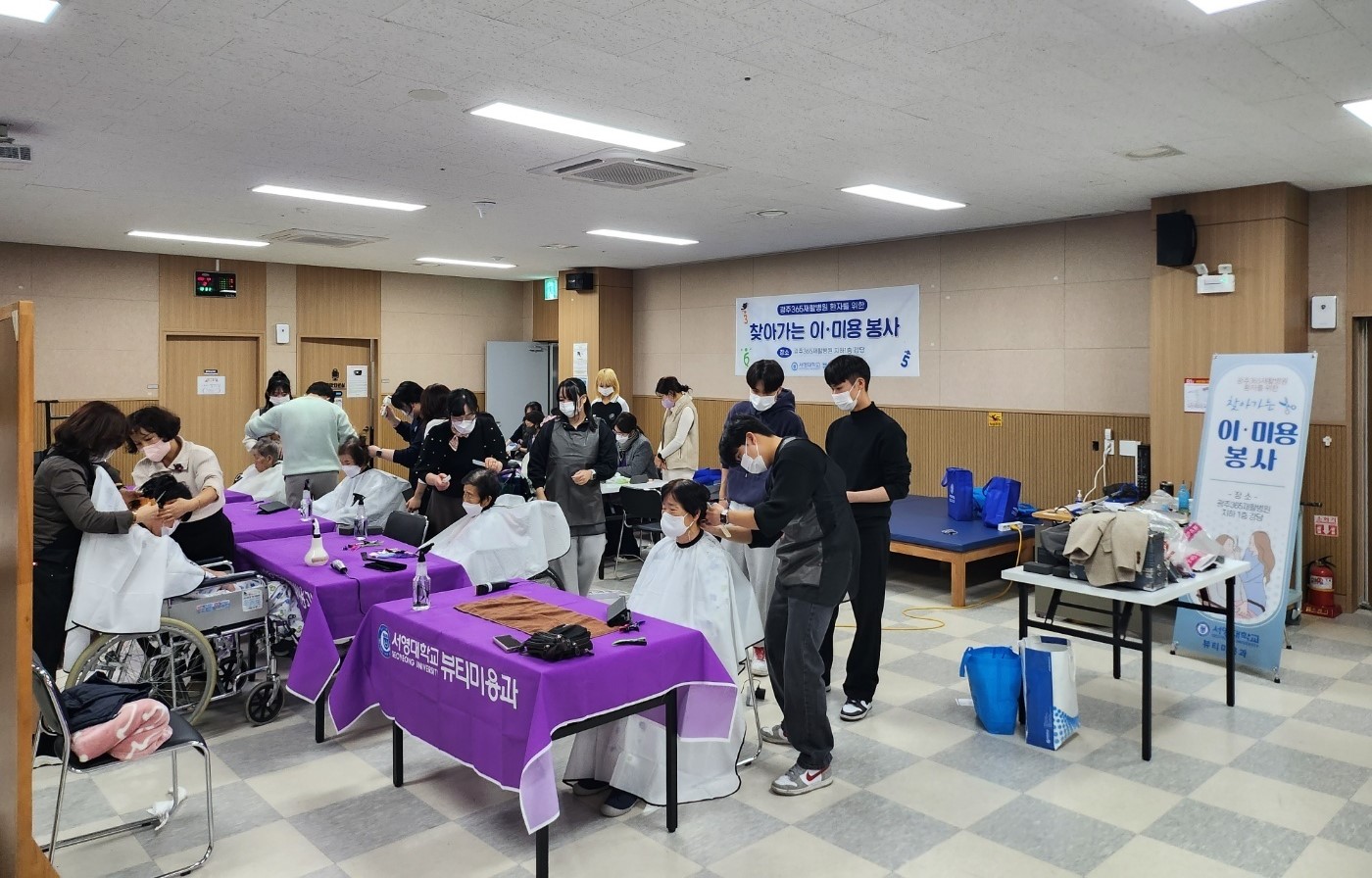 ○ 이날 뷰티미용과 전공동아리 ‘SYBG’ 학생 11명은 헤어커트 담당 9명과 네일케어 담당 2명으로 나뉘어 40여명의 환자들의 헤어와 네일을 관리해 주는 재능기부활동을 벌였다.