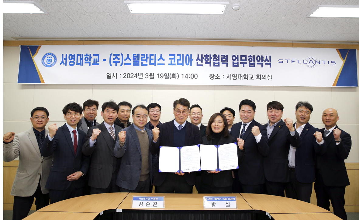 O. 우리대학(총장 김정수)은 3월19일(화) 주식회사 스텔란티스코리아(대표이사 방실)와 자동차 신산업 발전 및 우수 인재육성 사업추진을 위한 업무협약을 체결하였다. 서영대학교 회의실에서 진행된 협약식은 서영대학교 부총장 김순곤, 입학홍보처장 장철인, 학생취업처장 김명재 외 서영대학교 관계자와 주식회사 스텔란티스 코리아 대표이사 방실 외 주식회사 스텔란티스 코리아 관계자 15명이 참석하였다.