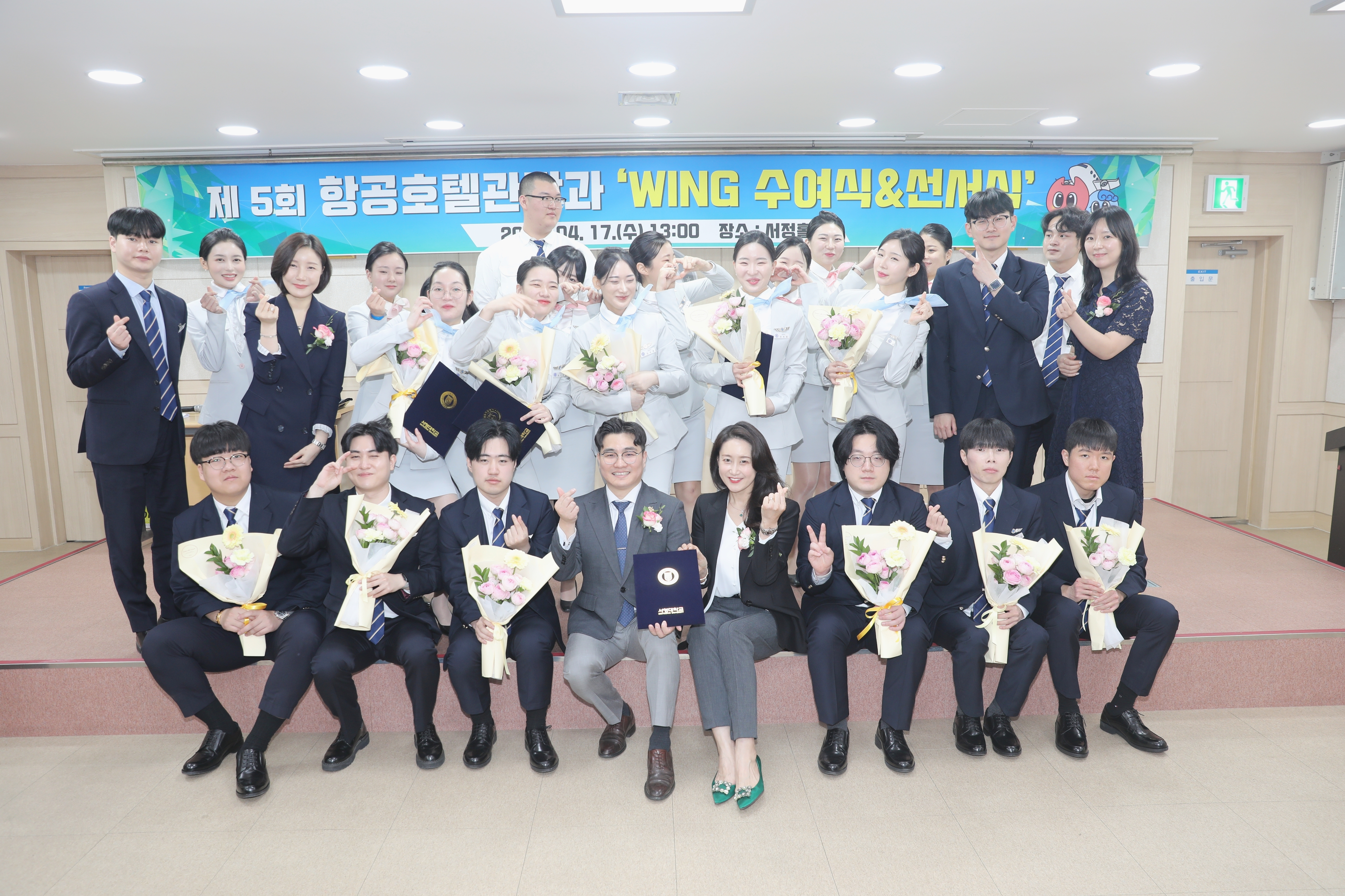 ○ 이날 행사는 학과교수와 선배들이 신입생들에게 윙 배지를 수여함과 동시에 응원의 메시지를 전하고, 신입생들은 항공·호텔·관광분야의 전문가로 성장하겠다는 다짐의 자리였다.