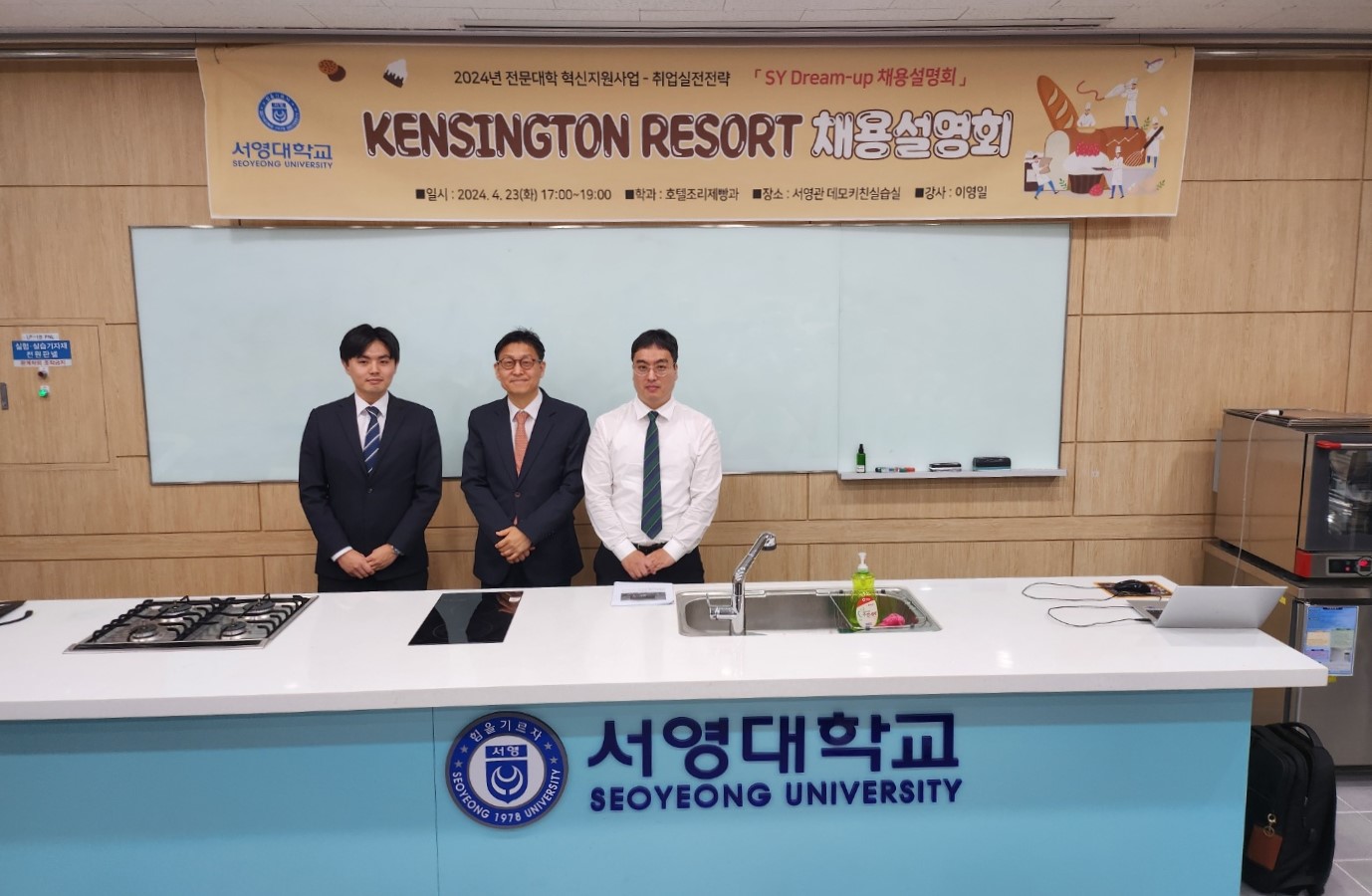 ○ 서영대학교는 최근 켄싱턴호텔앤리조트 하동점 총지배인과 본부 인사팀 담당자가 호텔조리제빵과를 방문해 'SY Dream-up 채용설명회'를 진행했다고 29일 밝혔다.