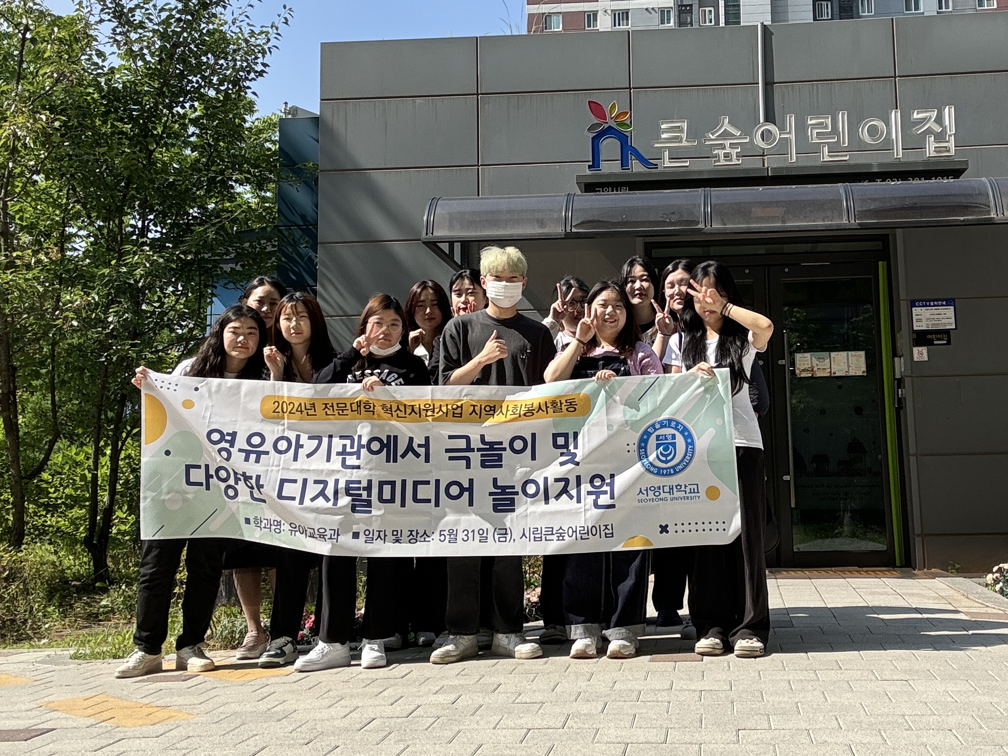 O. 우리대학(총장 김정수) 유아교육과(학과장 이지영)는 지역사회 영유아를 위한 봉사활동을 진행하였다. 큰숲어린이집, 향지어린이집에서 진행된 지역사회봉사활동에는 유아교육학과 송민서교수, 문소라교수와 대표 유혜빈 외 유아교육과 봉사동아리 사나래 회원 총 14명이 참여하였다.