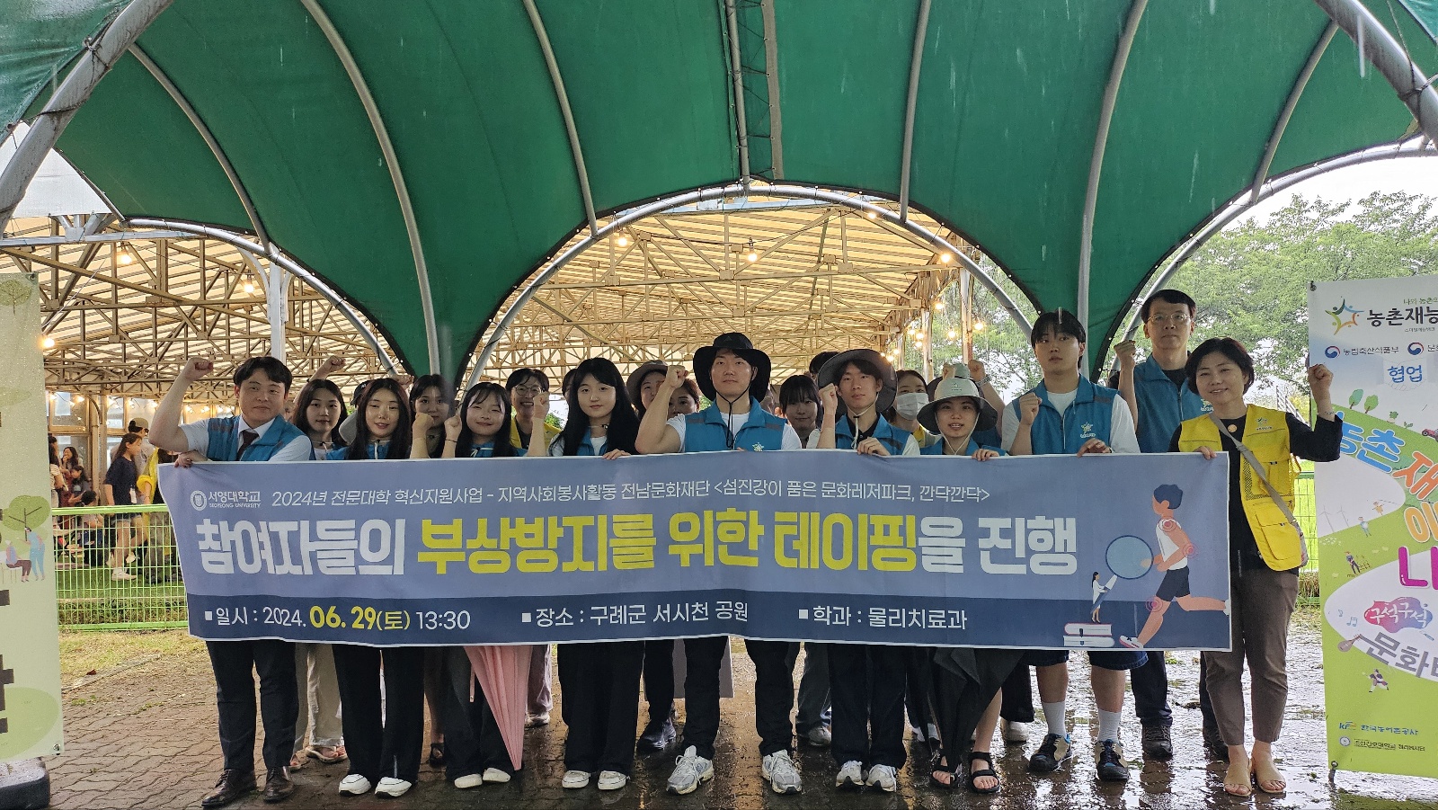 ○ 서영대학교 물리치료과는 최근 구례 서시천 체육공원에서 '참여자들의 부상 방지를 위한 테이핑' 체험행사를 조선간호대 학생들과 함께 전개했다고 2일 밝혔다.